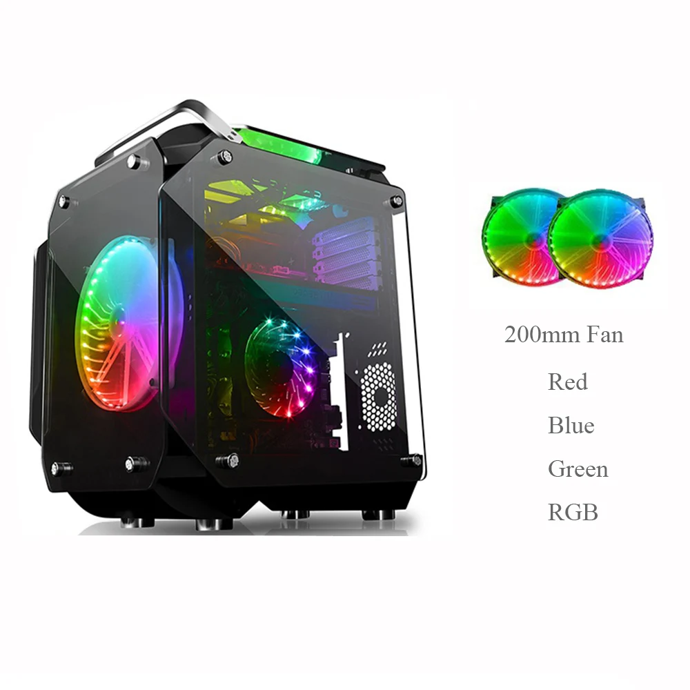 Тип Чехол для компьютера Super ATX Источник питания ATX Стандартный понижающий источник питания Материал Алюминий + закаленное стекло Совместимая материнская плата ITX / MICRO ATX Чехол с размерами 380*290*480 мм Толщина 5 мм Ограниченная длина видеоадаптера 280 мм Высота кулера процессора ограничена 140 мм Жесткий диск HDD * 1; SSD * 1 Интерфейс панели USB3.0 * 1;USB2.0 * 2; HD аудио * 1 Вентиляторы Передняя панель: 20 см * 1(В комплекте); Верхняя панель: 20 см * 1(В комплекте); Верх: 80 мм * 1(Опционально) Водяное охлаждение(Опционально) Поддерживается