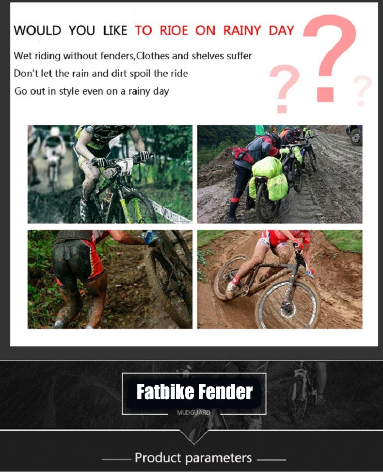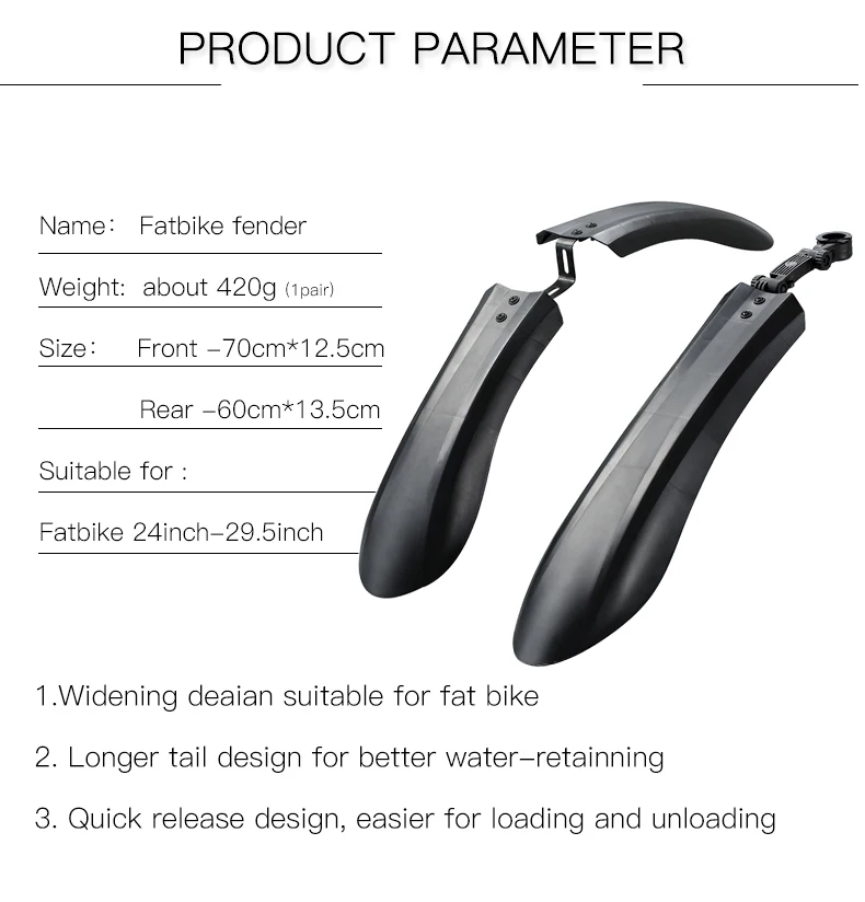 Название: 26-29 дюймов * 4,0 толстой велосипед крыло Материал: высококачественный пластик Вес: about420g Размер: длина спереди 35*35*12,5 (см) Задняя длина 60*13 (см) Подходит для: фэт
