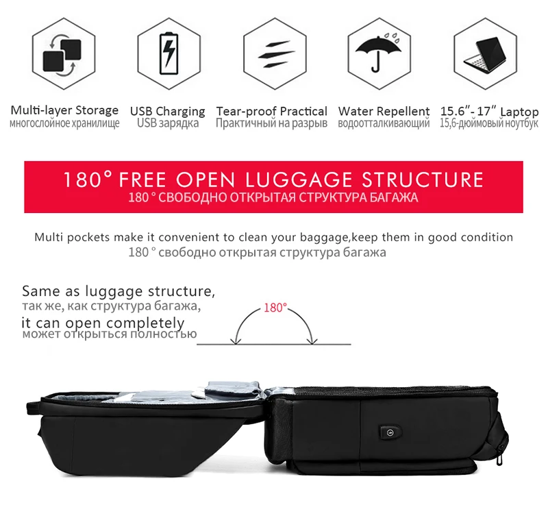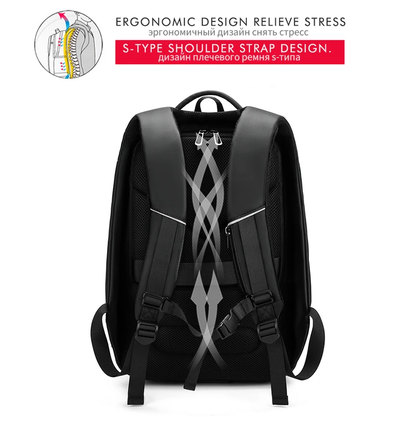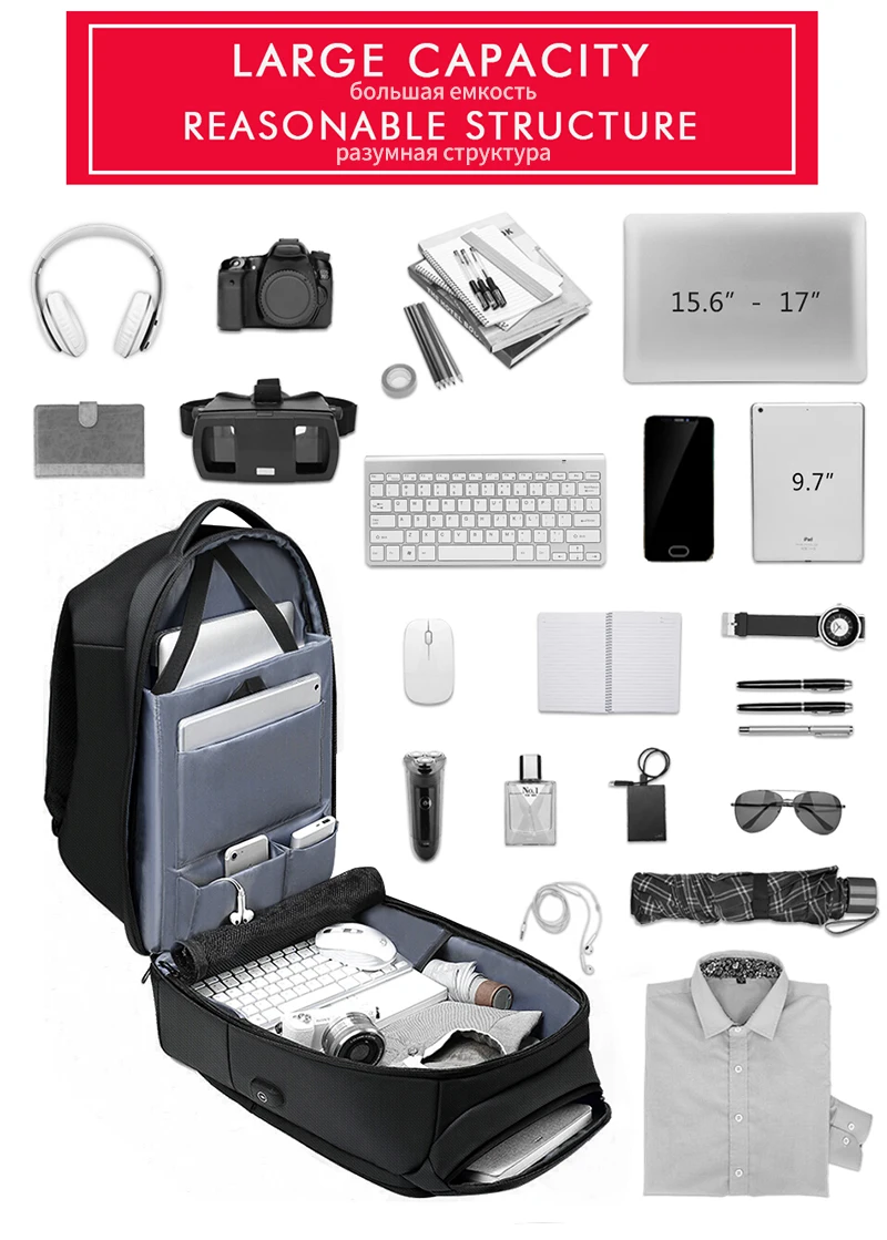 Особенности: 1: сетчатая фиксированная Основная сумка. 2: 17,3 дюймов Сумка для ноутбука. 3: усиленный плечевой ремень. 4: много отделений. 5: скрытая молния с защитой от кражи. 6. Дышащий дизайн сзади. 7: вместительный, многофункциональный карман. 8: Внешний порт USB для зарядки, только usb-порт, внешний аккумулятор не входит в комплект. 9: высококачественный материал, водонепроницаемый, устойчивый к царапинам и прочный.