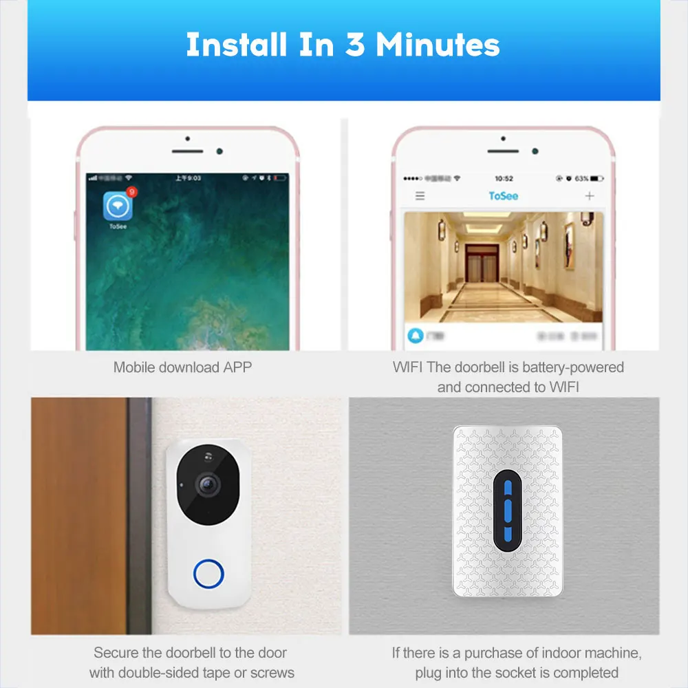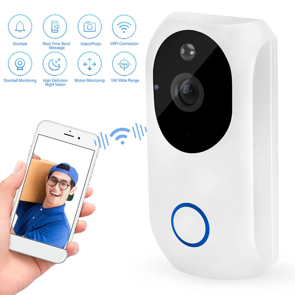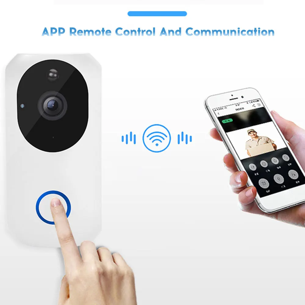 Дверной Звонок может управляться с помощью приложения, автоматической рабочей модели, умной и портативной. Wi-Fi подключение, нет необходимости в проводе, широкий диапазон монитора 166 °, многофункциональное обнаружение движения, ночное видение высокой четкости, безопасный, надежный и практичный. Мобильный телефон в режиме реального времени, поддерживает двухсторонние звонки, фотографии, запись, забота о вашей семье делает вас более безопасным.