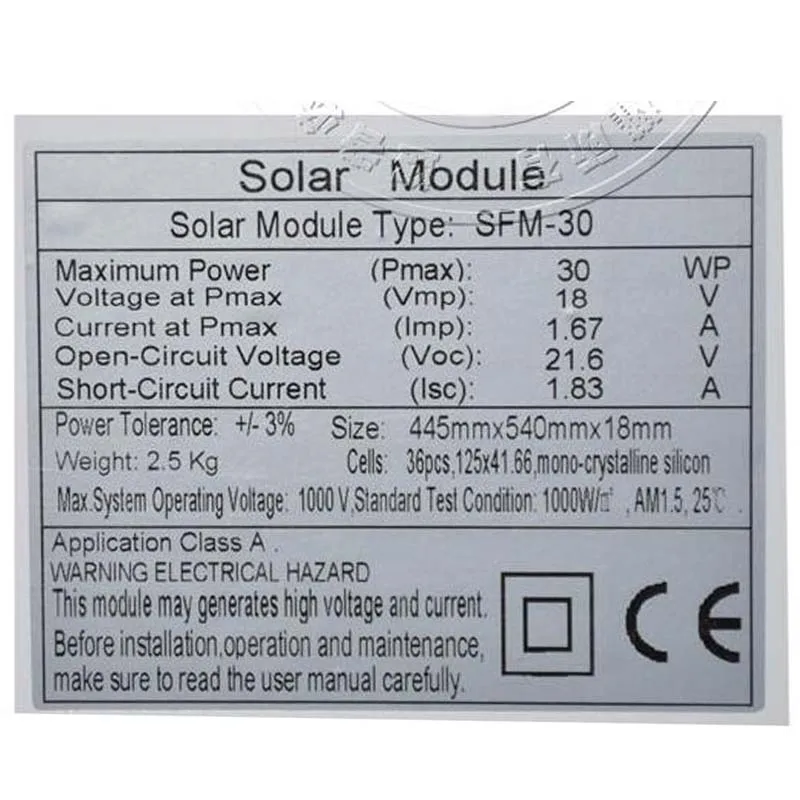 Module Pmax :30W Size and Number of Cells:125*41.7mm 36 Pcs / 4*9 Tolerance:± 3% Vmp:17.2V Imp :1.74A Voc:21.6V Isc :1.90A Max.Syst.Oper.Voltage:800V Dioders:0 by-pass Dimension:445*540*30mm Weight:2.7Kg Operate Temp.Scope:-40 degree t0 80 degree Relative Humidity:0 to 100% Resistances:227g steel ball falls down from 1m high and 60m/s wind speed Warranty:Pm is not less than 90% in 10 years and 80% in 25 years