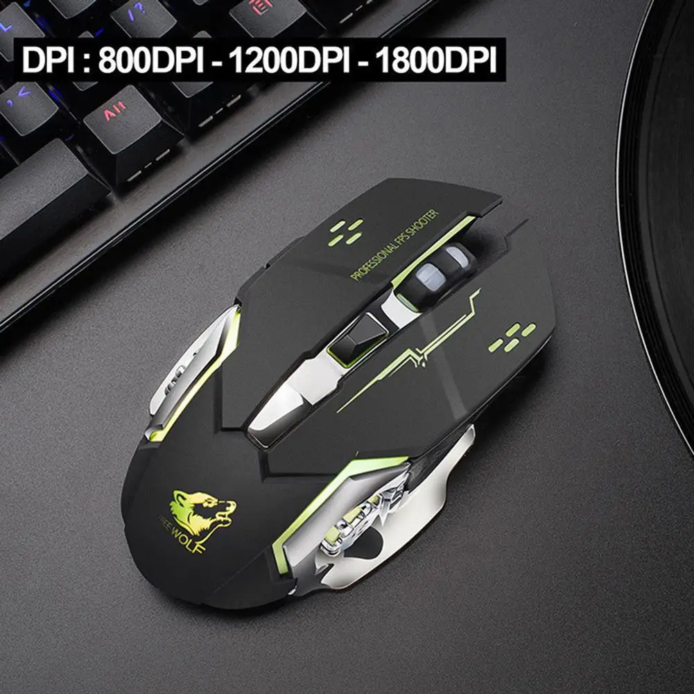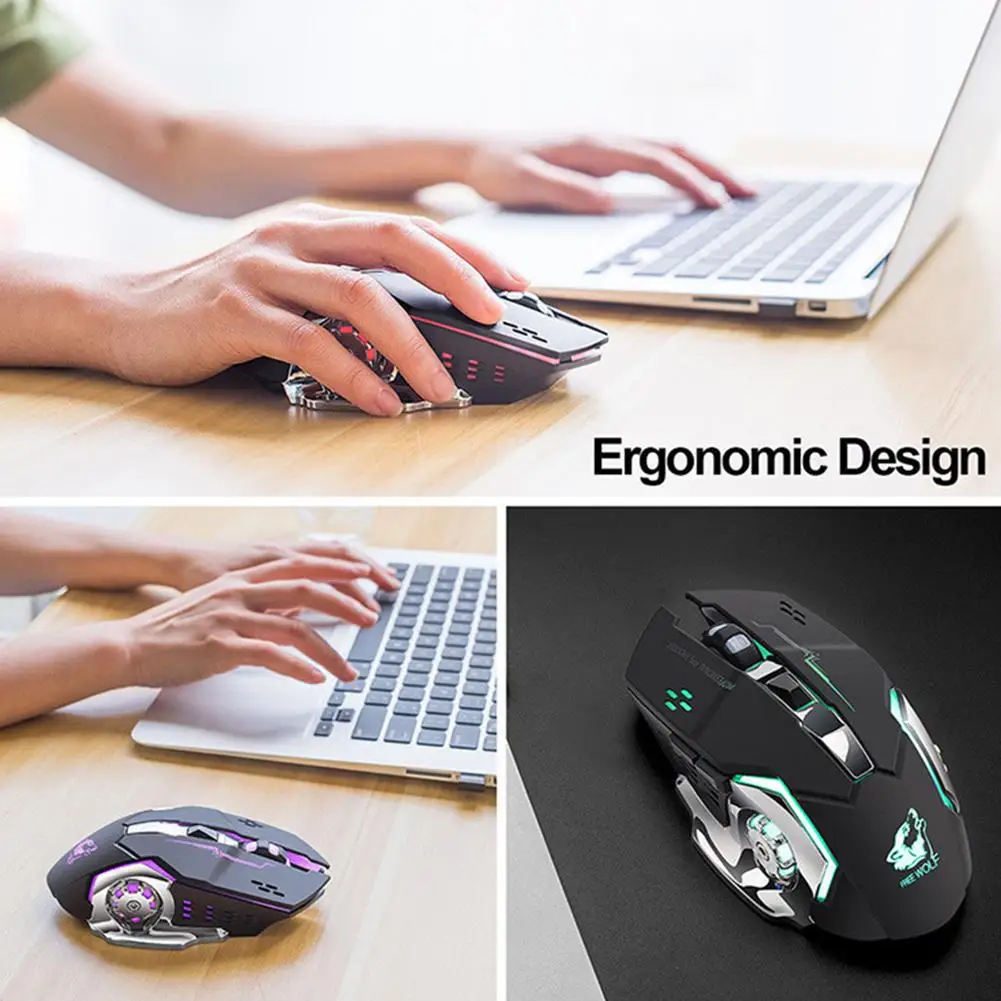 Он имеет беспроводную технологию 2,4G, семицветный рециркулирующий светильник, встроенный перезаряжаемый литиевый аккумулятор, регулировка DPI трехскоростной сдвиг, эргономичный дизайн моделирования поверхности.1 * коврик для мыши