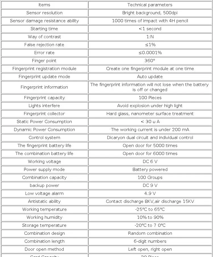 Мы используем международную передовую биотехнологию для обеспечения ее высокого качества; 4 батарейки типа АА; Ручки могут предотвратить разрушение; Четыре способа открыть дверь: отпечаток пальца + пин-код + карта + механический ключ.