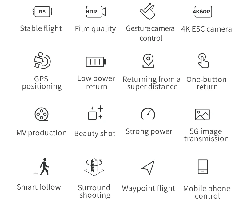 Вверх/вниз вперед/назад, поворот влево/вправо, боковой полет, удержание высоты, возврат одной кнопкой, Безголовый режим фото/видео, передача Wi-Fi, опция позиционирования потока