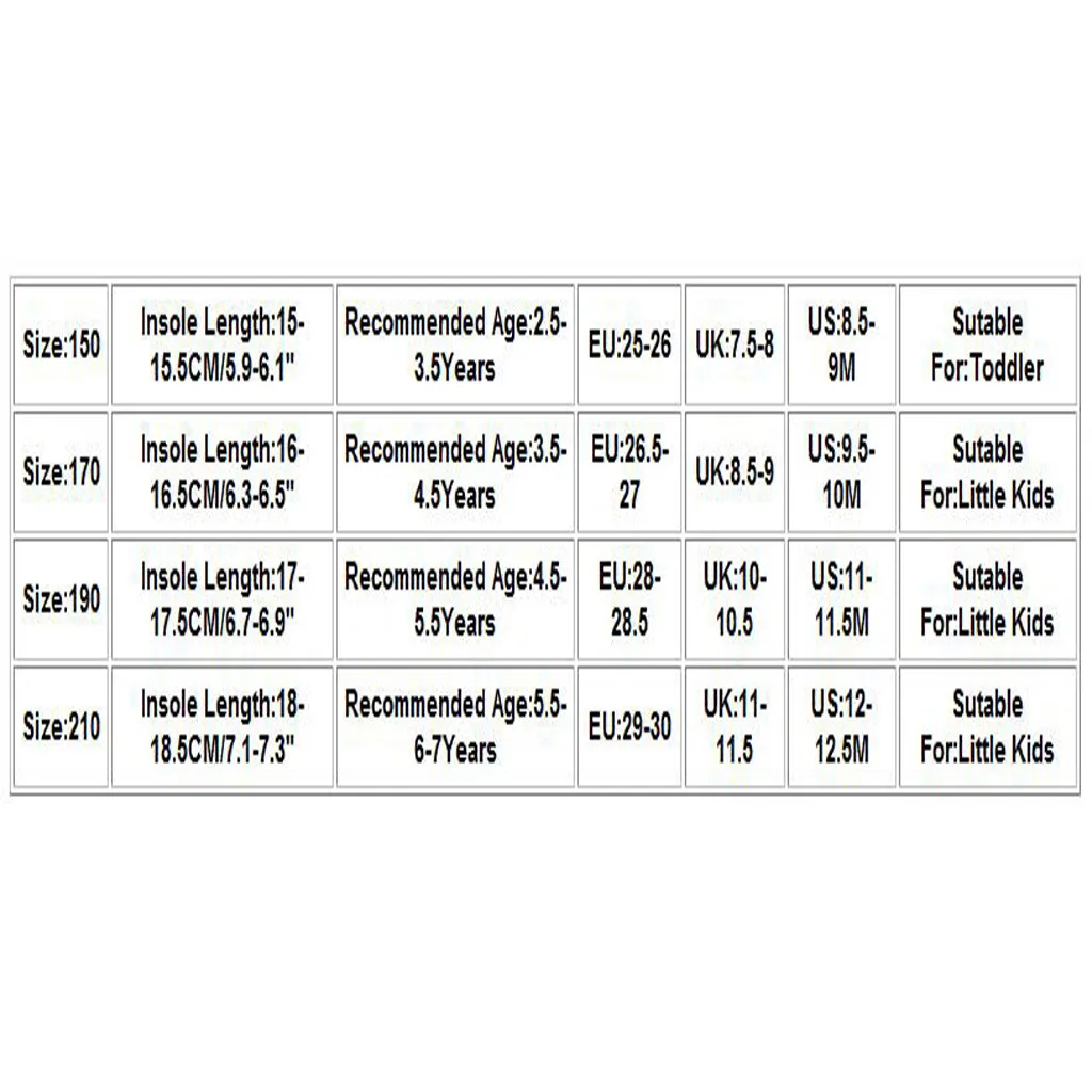 Размер Стельки Длина Рекомендуемый возраст ЕС Великобритания Свяжитесь с нами Удобен для 150 15-15,5 см/5,9-6,1" 2,5-3,5 лет 25-26 7,5-8 8,5-9 м Для детей ясельного возраста 170 16-16,5 см/6,3-6,5" 3,5-4,5 лет 26,5-27 8,5-9 9,5-10 м Дети дошкольного возраста 190 17-17,5 см/6,7-6,9" 4,5-5,5 лет 28-28,5 10-10,5 11-11,5 М Дети дошкольного возраста 210 18-18,5 см/7,1-7,3" 5,5-6-7Years 29-30 11-11,5 12-12,5 М Дети дошкольного возраста
