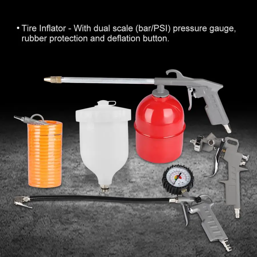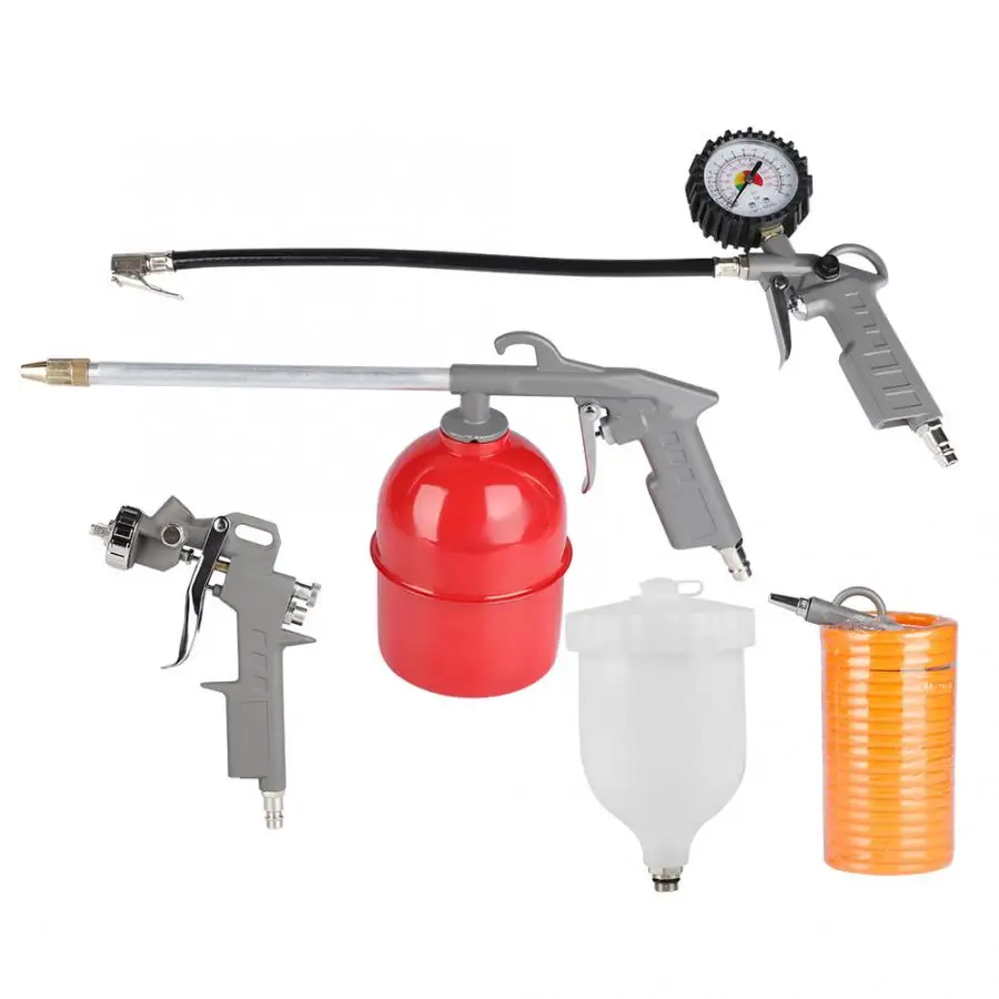 Этот воздухНабор инструментов включает в себя гравитационный пистолет-распылитель, пистолет-удар, накачиватель шин с манометром, пистолет для очистки воздуха и воздушный шланг 5 м. Он имеет широкое применение и высокую практичность.