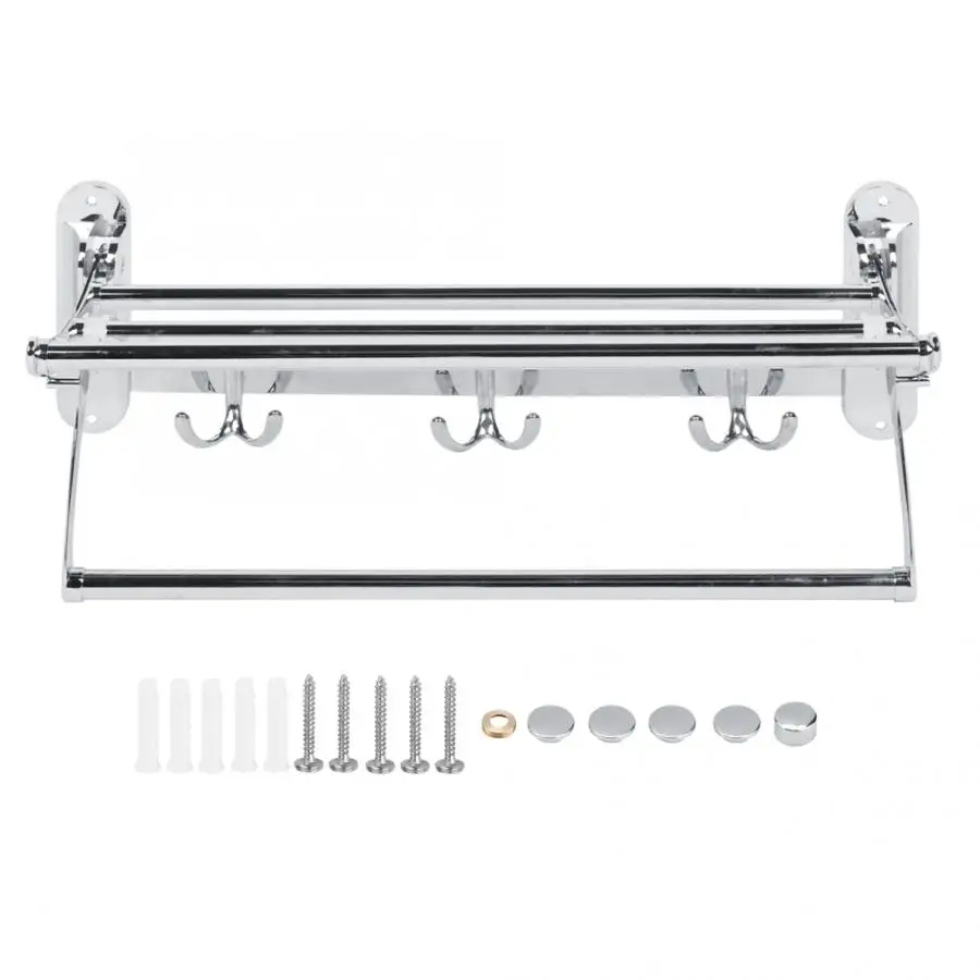 DescriptionBathroom Stainless Steel Wall Mounted Folding Towel Rack Storage Holder Shelf with 3 Hooks