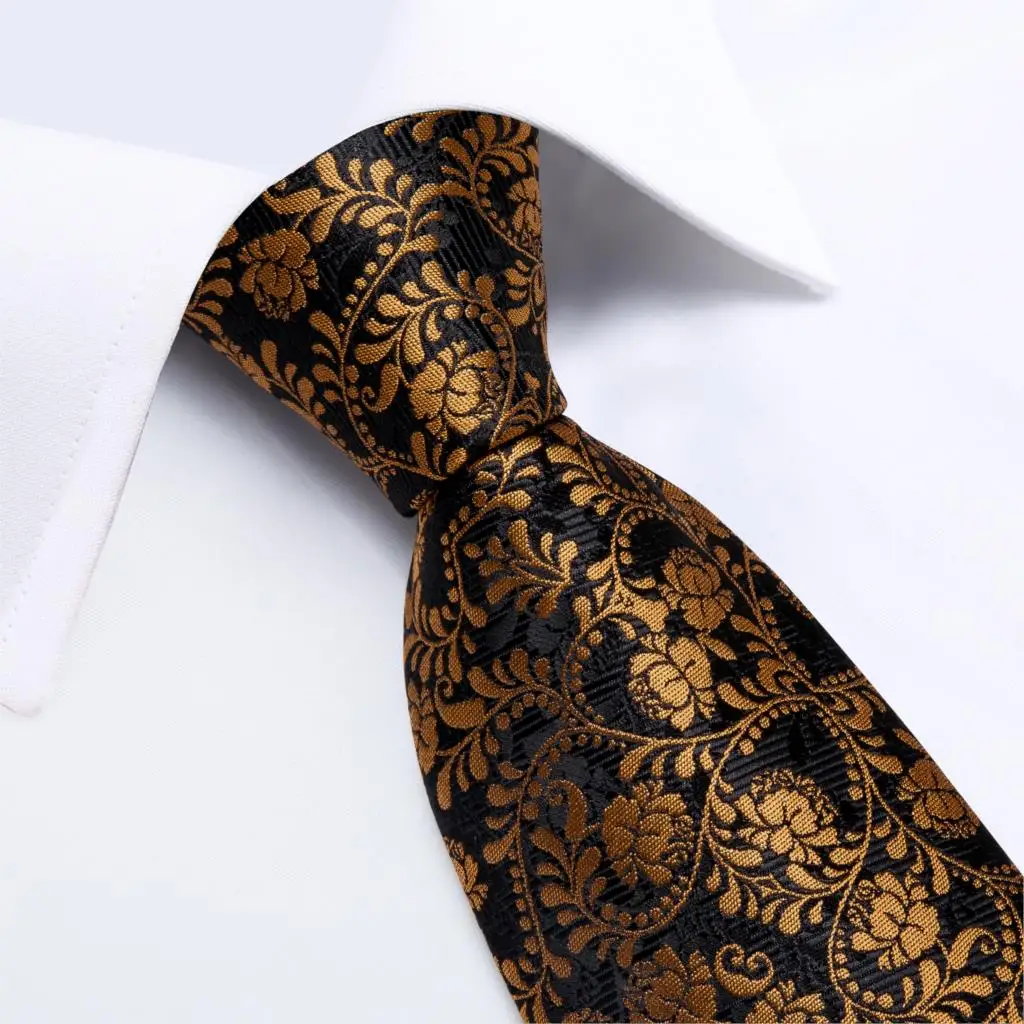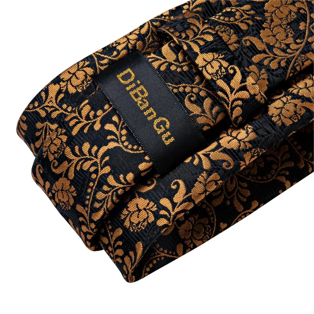 DiBanGu дизайнерский Мужской Шелковый Свадебный галстук, золотой черный цветочный модный галстук для мужчин, галстук, кольцо, Hanky, запонки, набор, деловые Вечерние