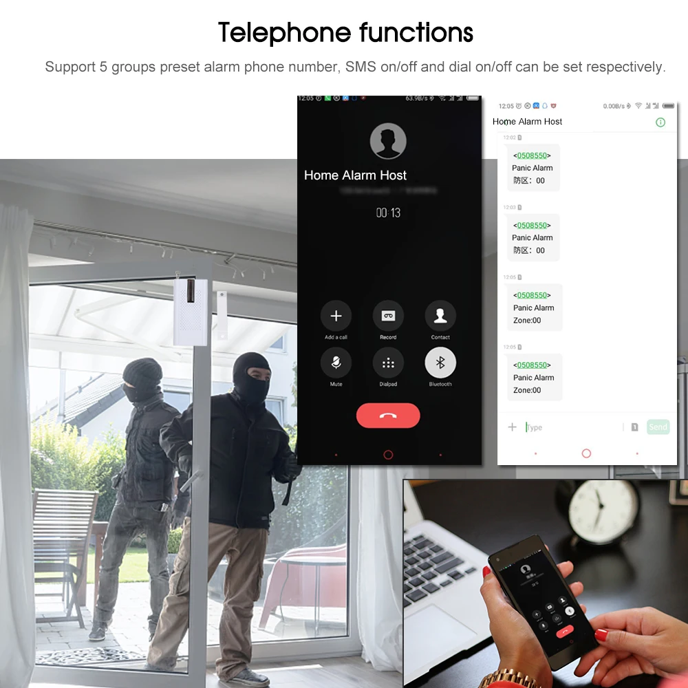 * Поддержка зоны защиты s: ворота поддержки, SOS, спальня, окно, балкон, периметр, дым, газ, окись углерода, утечка воды.