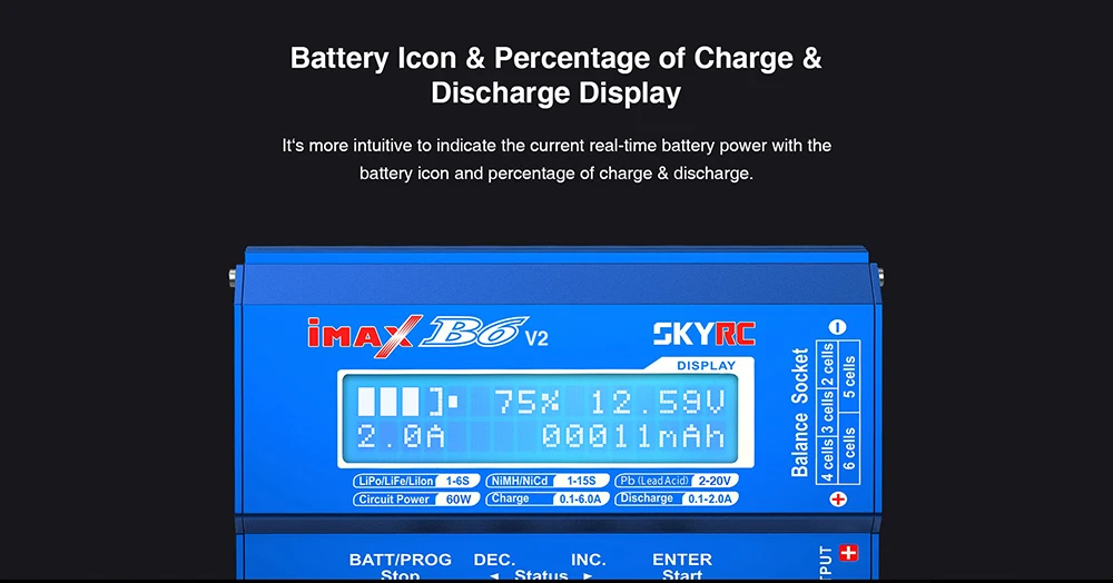 Батарея типа/ячейки: LiPo/LiHV LiFe/литий-ионным: 1-6cells, никель-металл-гидридного/гидридных и никель-кадмиевых типов аккумуляторов: 1-15cells, Pb: 2-20V