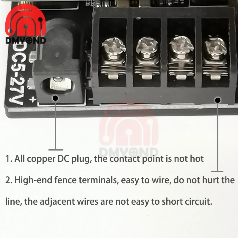 Он принимает медный разъем постоянного тока и забор типа терминала. Он может выдерживать большой ток, не нагреваться, не повредить провод, хорошую проводку и короткое замыкание.