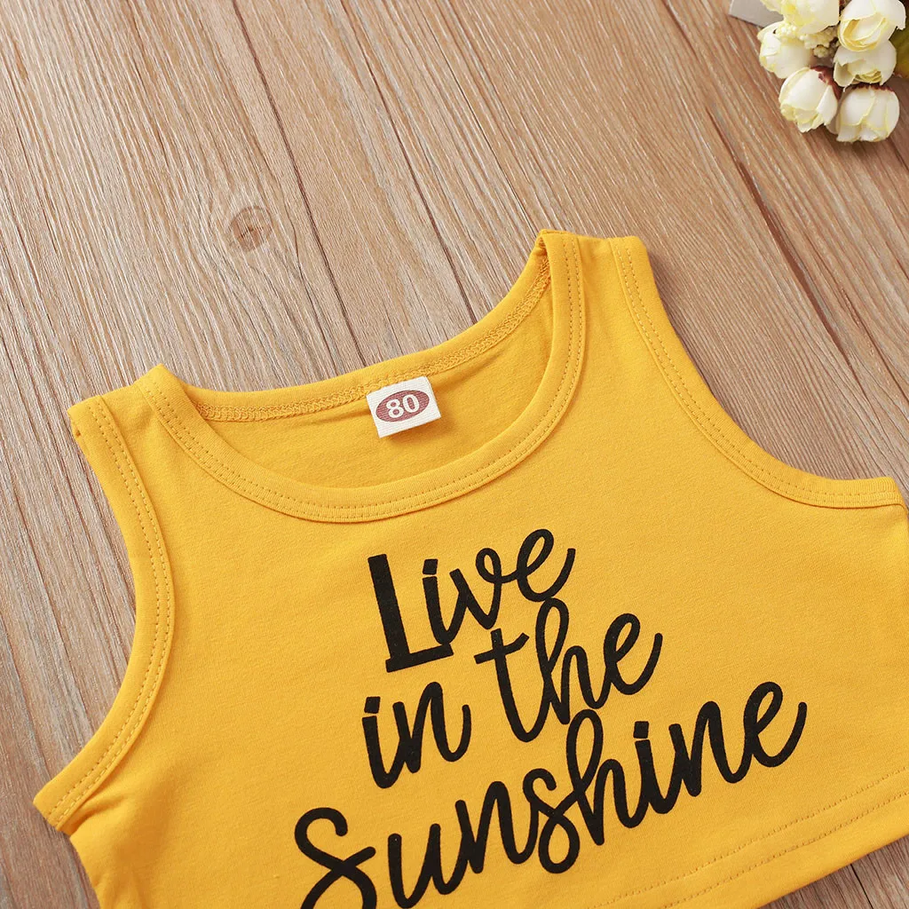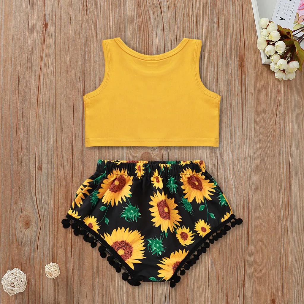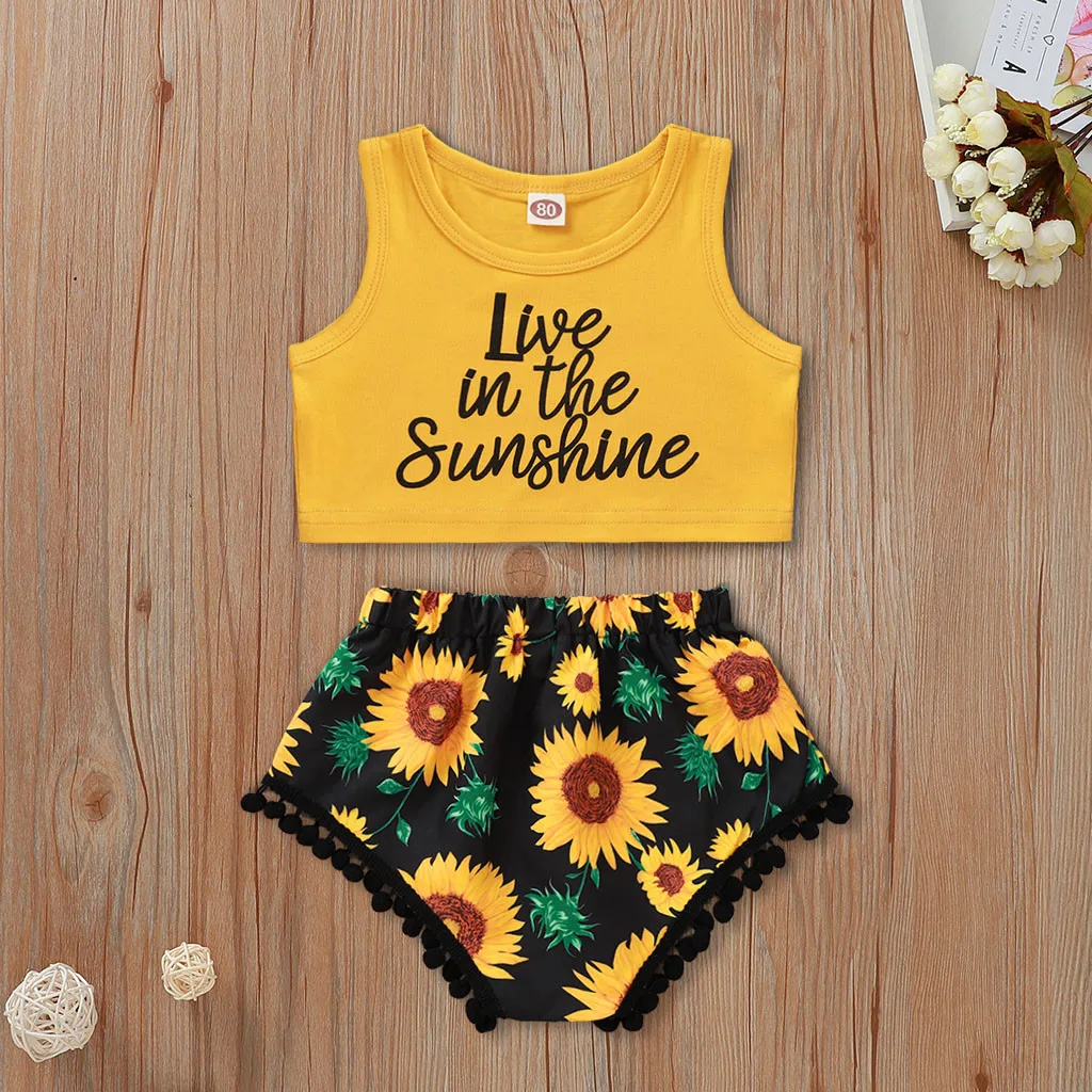 Жилет без рукавов с буквенным принтом для маленьких девочек топы + шорты с подсолнухами и кисточками