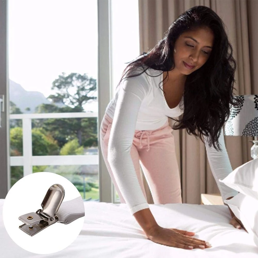 Зажим для простыни изготовлен из прочных хромированных металлических зажимов и сверхмощных широких эластичных Нейлоновых Лент, прочный, экологически чистый и устойчивый к ржавчине.