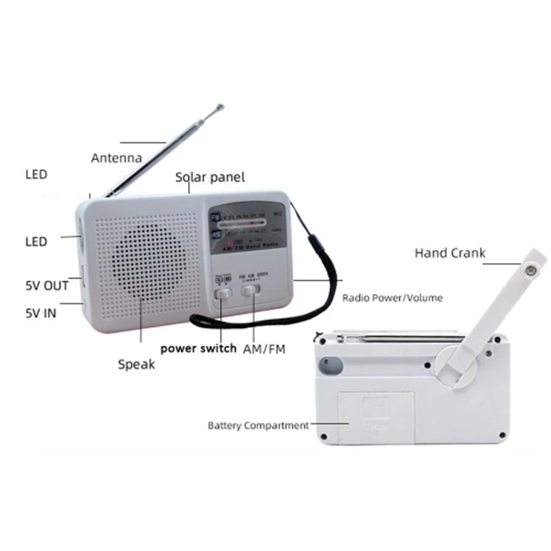 Аварийный внешний аккумулятор: когда ваш мобильный телефон вне батареи на открытом воздухе, подключите радио через usb-порт с телефоном и используйте руку, чтобы повернуть ручку, может использоваться в качестве аварийного банка питания для мобильных телефонов.