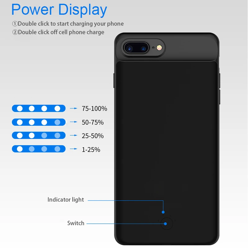 Основные Особенности: 100% абсолютно новый высококачественный Уникальный дизайн с ультратонким чехол сделает ваш телефон более привлекательным Быстрая скорость подзарядки для удобного использования Постоянный ток зарядки и разрядки гарантирует частоту повреждения телефона Параметры: Тип: резервные банки питания Совместимость: 3700 мАч для 6Plus/7Plus/8Plus 7200 мАч для 6Plus/7Plus/8plus Материал: ТПУ, поликарбонат Тип ячейки: литий-полимерный аккумулятор Специальные функции: чехлы для аккумуляторов для iPhone Вход: постоянный ток 5 В-1,2 А, макс. Выход: 5 в пост. Тока-1,0 А Цвет: черный, розовый, золотой, синий, красный Посылка включает в себя: Чехол для зарядного устройства телефона-1 шт.