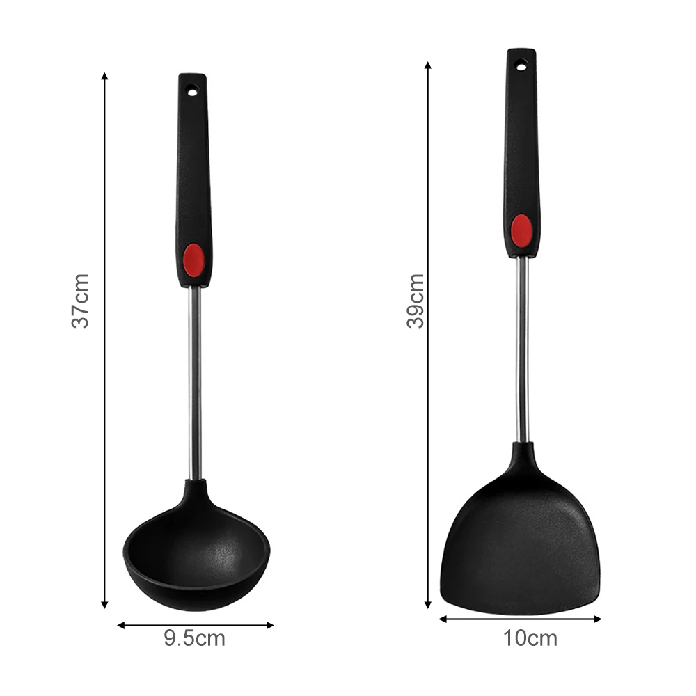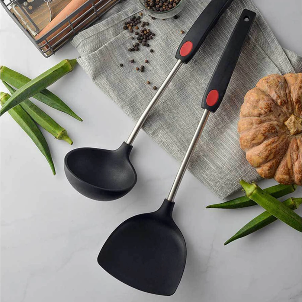 Этот набор посуды, содержащий лопатку и суп, идеально подходит для супа, стейков, овощей, теста, удаления печенья из запеченного листа и смешивания соусов, супов и кремов. Изготовлен из одобренного FDA высококачественного пищевого силикона, этот набор является экологически чистым, нетоксичным и легко чистится, который подходит в качестве подарка для любителей приготовления пищи или домашнего обогрева.
