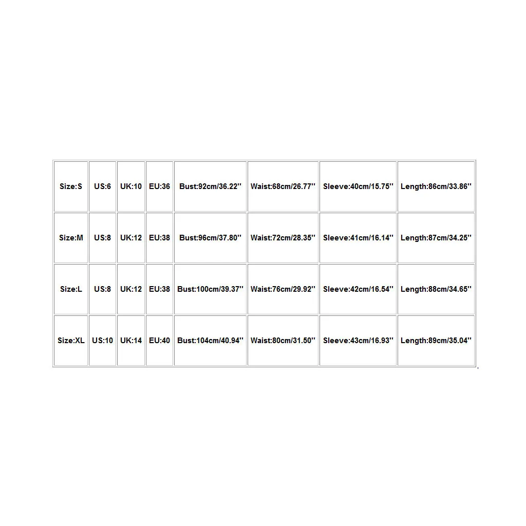 Size:SUS:6UK:10EU:36Bust:92cm/36.22''Waist:68cm/26.77''Sleeve:40cm/15.75''Length:86cm/33.86''Size:MUS:8UK:12EU:38Bust:96cm/37.80''Waist:72cm/28.35''Sleeve:41cm/16.14''Length:87cm/34.25''Size:LUS:8UK:12EU:38Bust:100cm/39.37''Waist:76cm/29.92''Sleeve:42cm/16.54''Length:88cm/34.65''Size:XLUS:10UK:14EU:40Bust:104cm/40.94''Waist:80cm/31.50''Sleeve:43cm/16.93''Length:89cm/35.04''