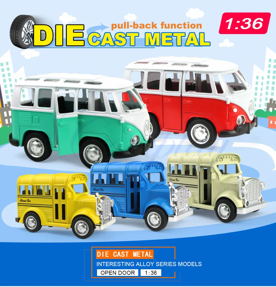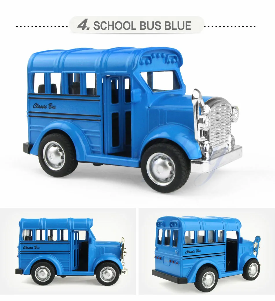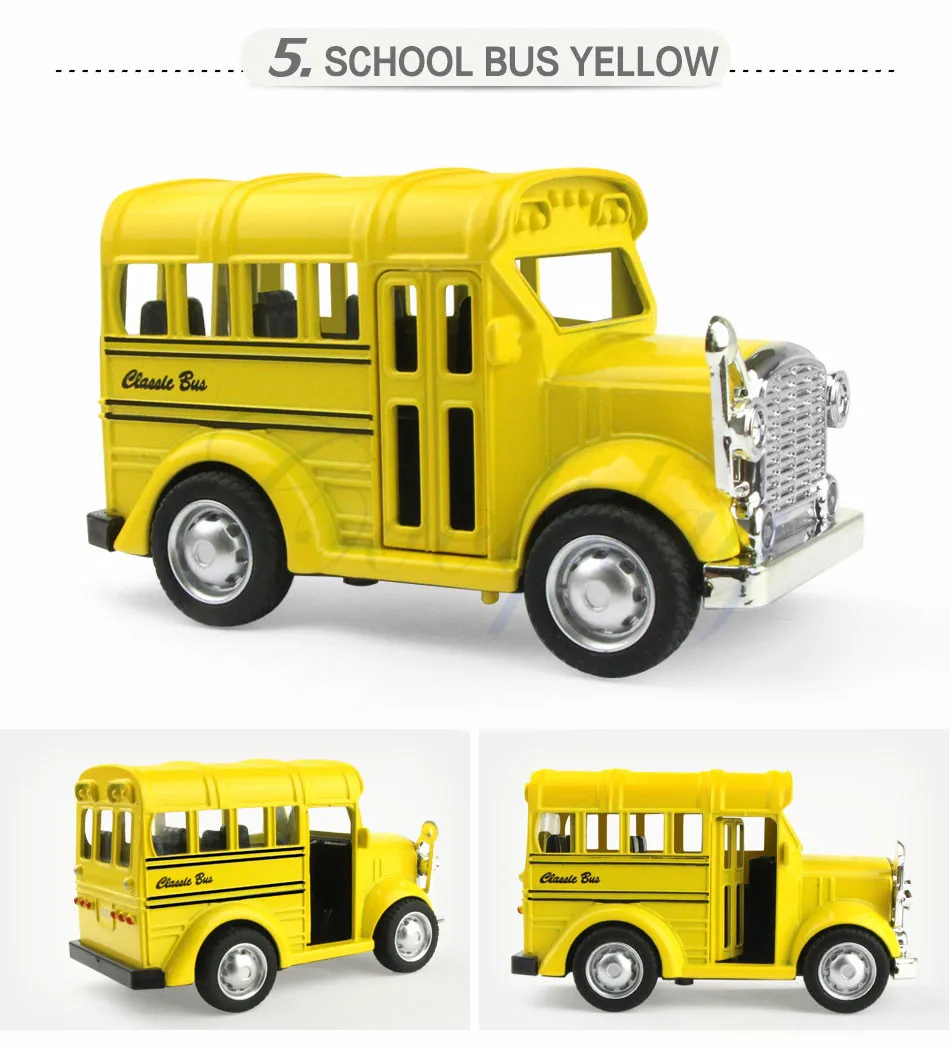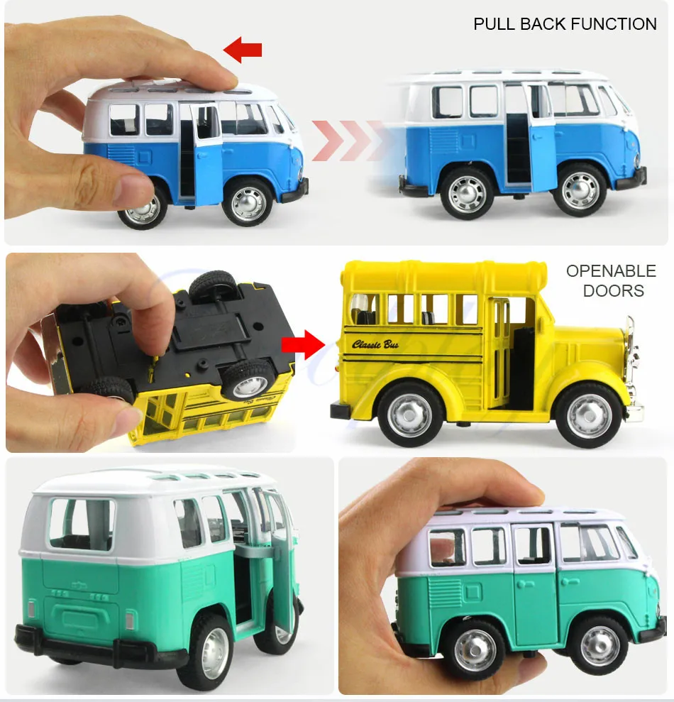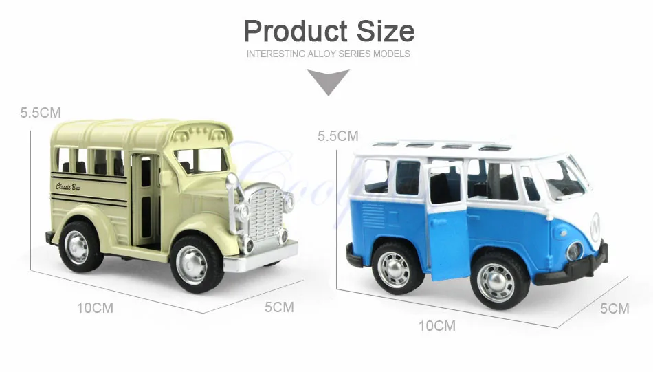 Размер: около 10x5x5,5 см; Цвет: автобус (красный, синий, зеленый)/школьный автобус (желтый, синий, бежевый) Материал: сплав, АБС-пластик