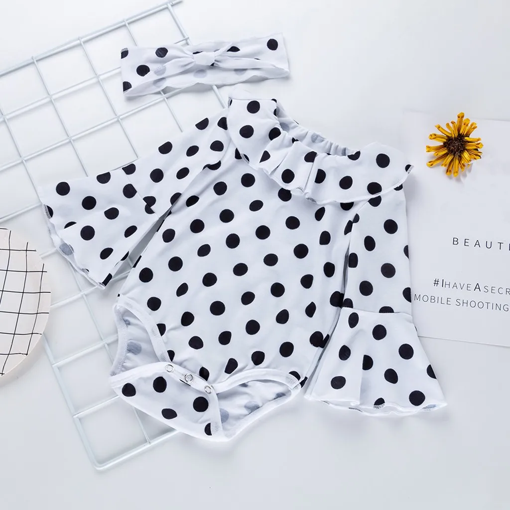 Комбинезон в горошек с расклешенными рукавами для новорожденных и маленьких девочек + повязка на голову, комплект одежды