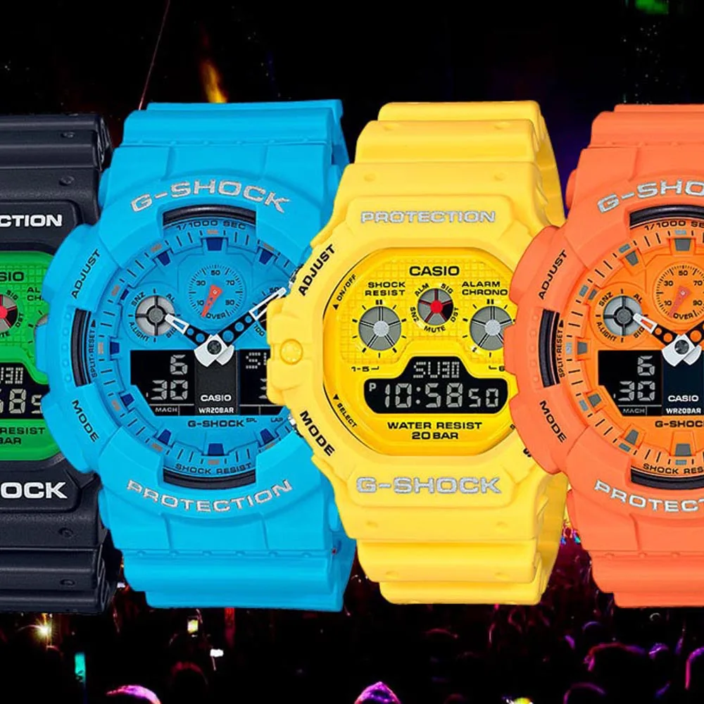 G-Shock. Вдохновением для создания этой цветовой вариации часов послужили всевозможные музыкальные фестивали, рок-концерты и другие молодежные мероприятия под открытым небом. Унисекс. Противоударный корпус защищает механизм от ударов и вибрации. Электролюминесцентная подсветка обеспечивает равномерное освещение всего циферблата, облегчая считывание данных. Мировое время. 12-ти и 24-х часовой формат времени. Секундомер точностью 1/100с и временем измерения 1ч. Сплит-хронограф. Таймер обратного отсчета от 1с до 24ч с автоповтором. Многофункциональные часы с ярким дизайном - выбор молодых и активных.