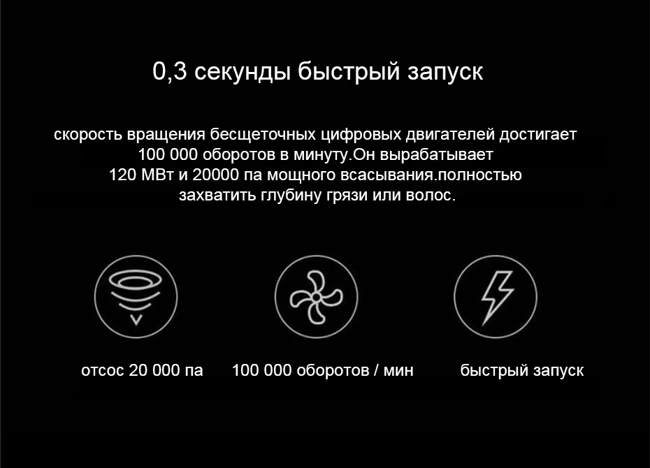 Бесщеточный цифровой двигатель Space3.0 Бесщеточный цифровой двигатель Space3.0 вращается до 100000 об/мин в минуту. Он генерирует 120AW и 20 000 Pa всасывания. Тщательно запечатлейте глубинную грязь или волосы.