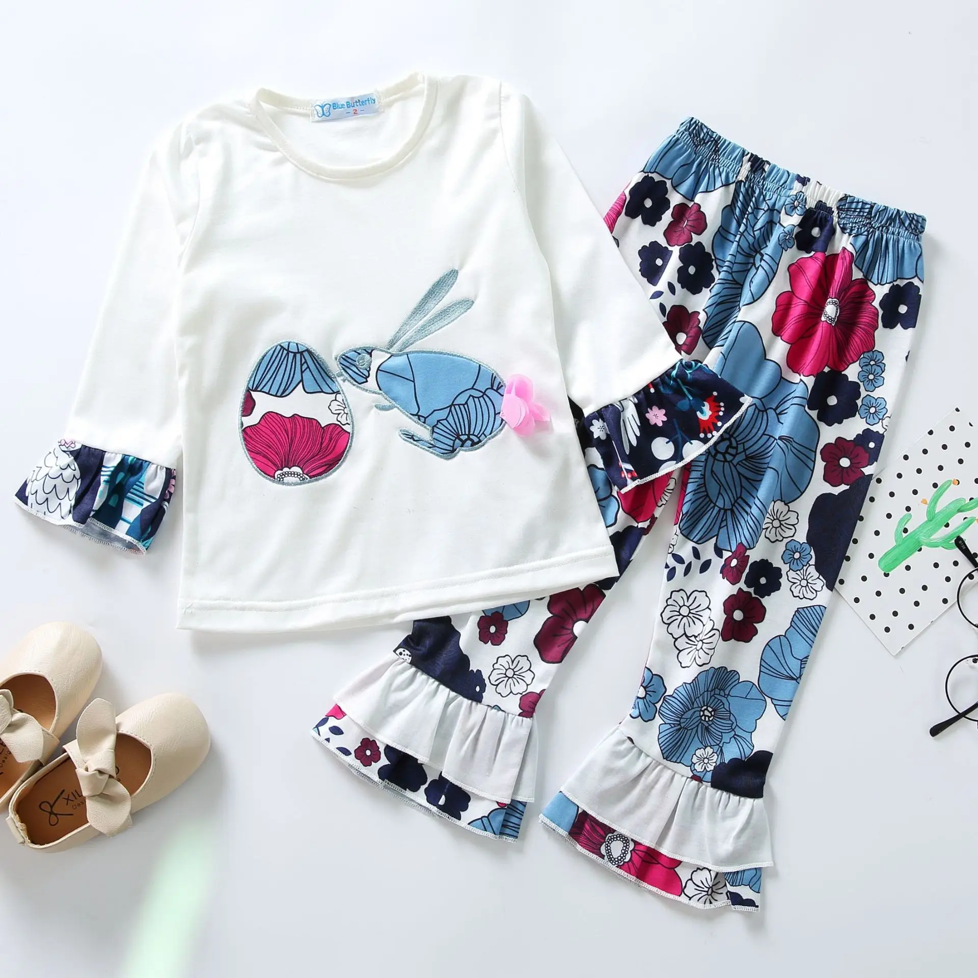 Пасхальные наряды для маленьких девочек; Бутиковые топы с изображением пасхального яйца и кролика; Одежда с расклешенными рукавами; Брюки с цветочным принтом; Комплект одежды для детей
