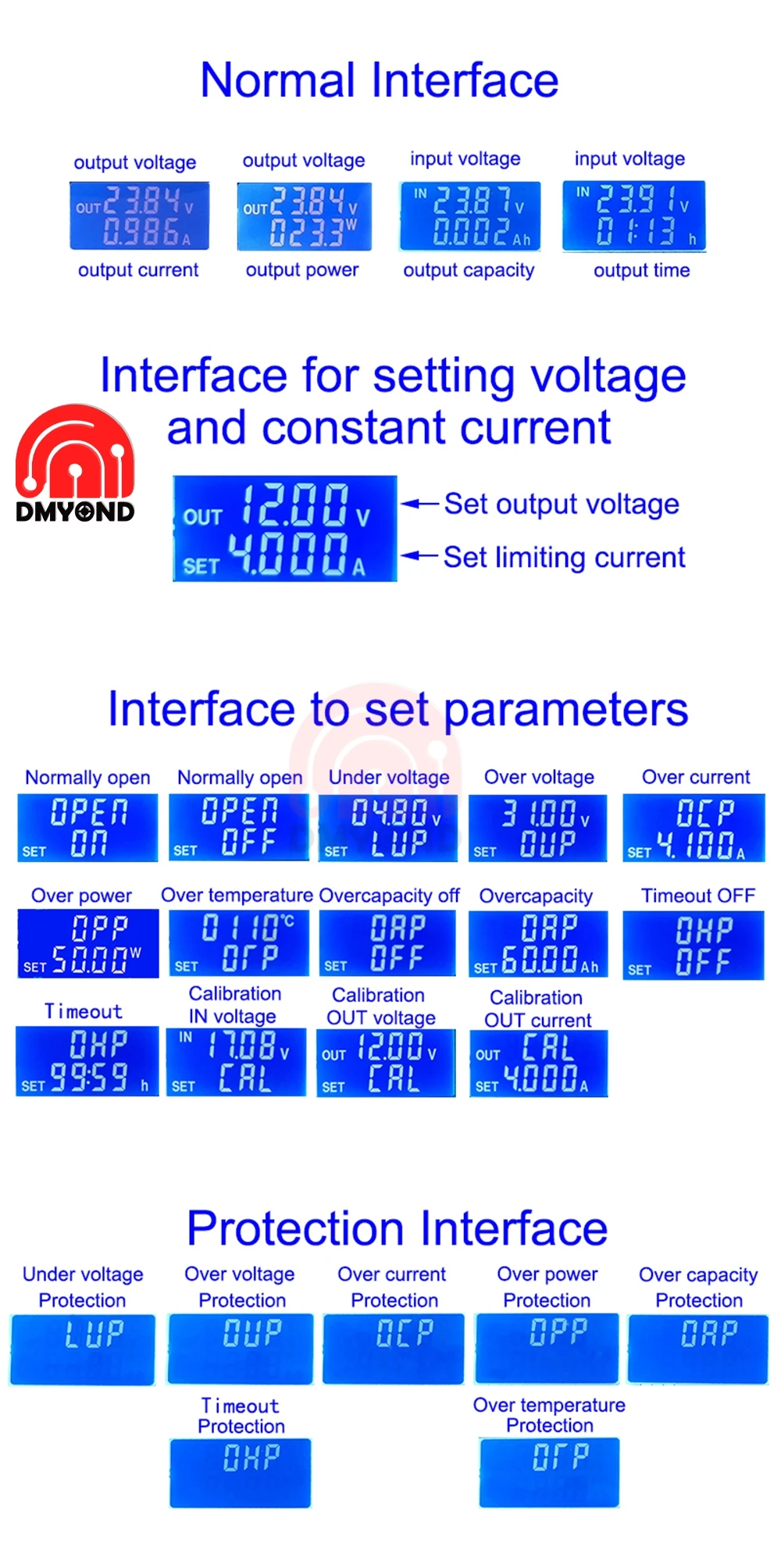 3. установите значение постоянного тока (т. Е. Максимальное значение тока, разрешенное к выходу модулем) -- нажмите кнопку U/I в обычном интерфейсе, чтобы войти в интерфейс постоянного тока с установочным напряжением. затем нажмите кнопку U/I и переключитесь на значение постоянного тока. Вы можете увидеть немного значения постоянного тока, мигающего. Поверните поворотный кодер влево и вправо, чтобы настроить основной и незначительный. короткое нажатие на поворотный кодировщик, чтобы выбрать, какой бит установить значение постоянного тока. после настройки нажмите U/I, чтобы выйти из интерфейса постоянного тока и вернуться к нормальному интерфейсу. или автоматически вернуться к нормальному интерфейсу после остановки работы в течение 10 с.