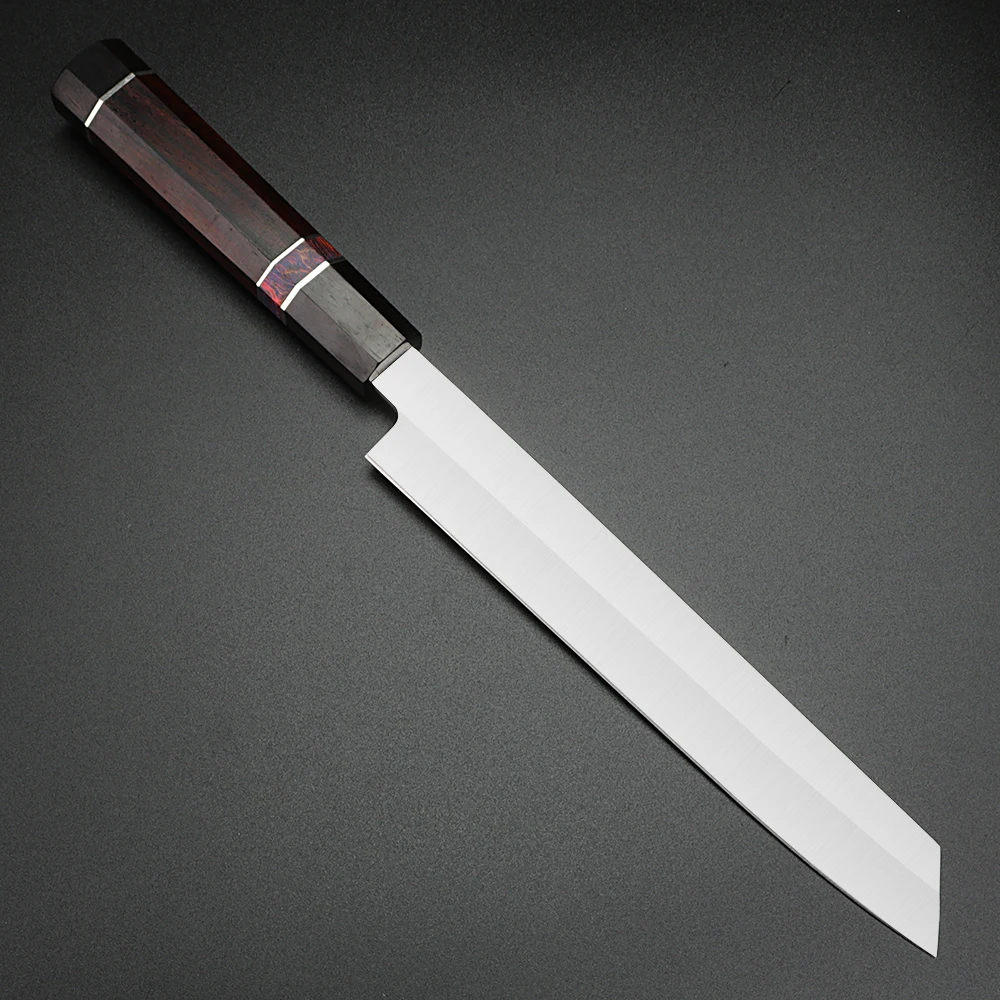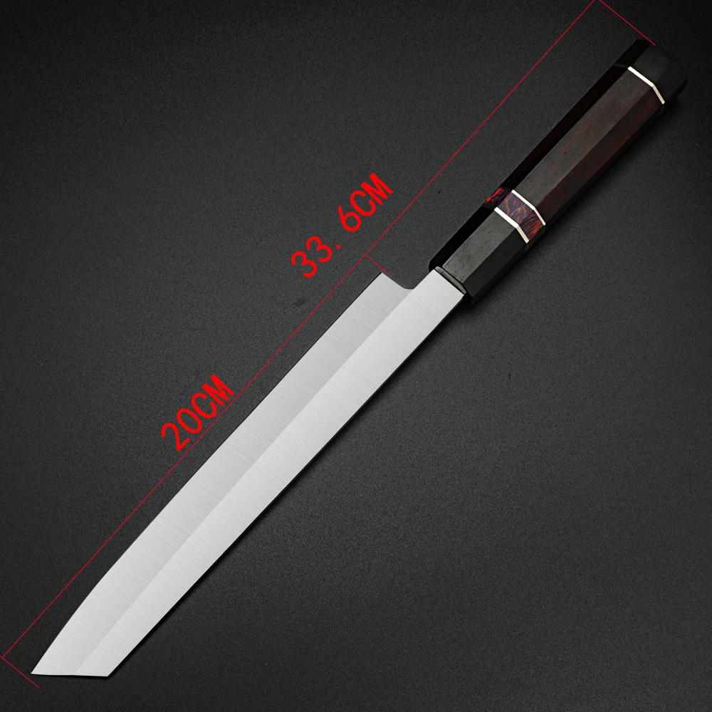 Материал лезвия: VG10 Материал ручки: дерево HRC (твердость Роквелла): 55-58 ° Общая длина ножа: 33,6 см Толщина листа: 0,3 см Ширина лезвия: 5,2 см