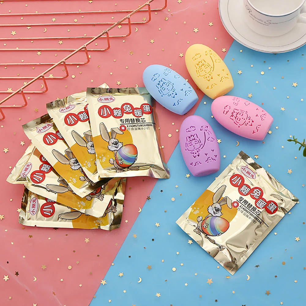 Упаковка поставляется с милой формой яйца, грелка для рук и заменяющее ядро, вам просто нужно положить заменяющее ядро в теплее, тогда ядро само будет производить тепло быстро, что может длиться 8-10 часов в 52 по Цельсию, очень практично для длительного использования.