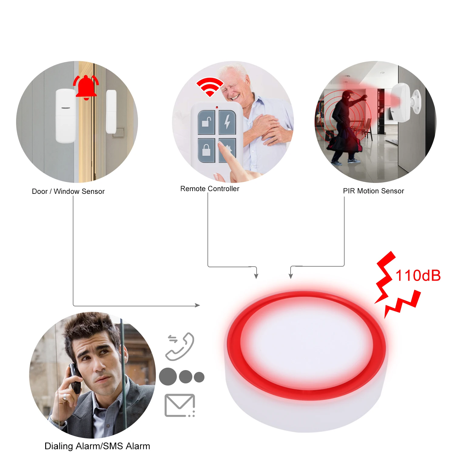 * После того, как детектор триггера системы сигнализации, система со звуком и светильник напоминание на месте, и сделать сигнал тревоги и отправить сигнал тревоги SMS на ваш телефон. Также мы подтолкнем сигнал тревоги к вашему телефону.