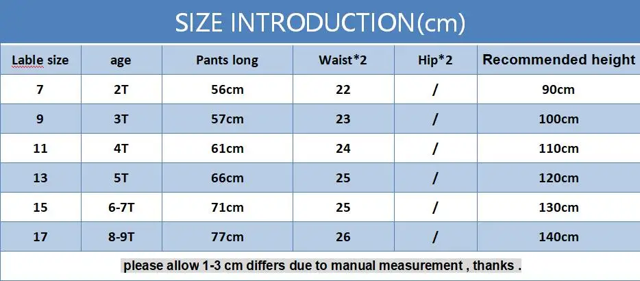 Размер этикетки: 7(2T)-9(3T)-11(4T)-13(5T)-15 (От 6 до 7 лет)-17 (От 8 до 9 лет)
