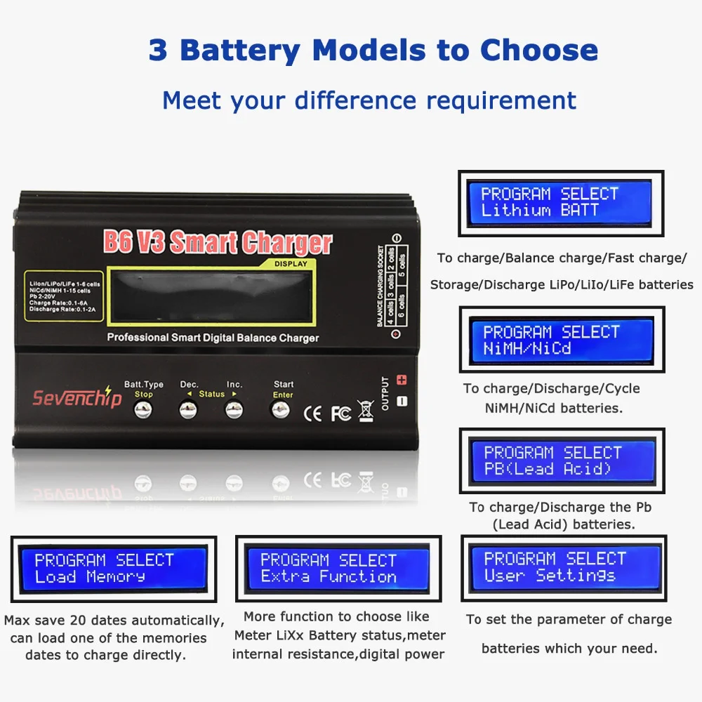 ESKY POWER B6 V3-это обновленная версия imax B6, разработанная ESKY POWER. Это цифровое умное многофункциональное зарядное устройство, которое поддерживает LiPo/LiIon/LiFe/NiCd/NiMH PB батареи, батареи высокой мощности LiHV и умные батареи I,II,III. Максимальная мощность зарядного устройства 80 Вт, разрядная мощность 10 Вт, максимальный зарядный ток 6А, разрядный ток 2A с высокой эффективностью зарядки. Обзор: материнская плата > Практичный для различных батарей: 1-6S Lilon/LiPo/LiFe/LiHV,1-15 ячеек Nicd/NiMh, 2-20 в PB батареи. Умный аккумулятор I,II,III. > Многофункциональность: зарядка, балансировка, разрядка, контроль напряжения терминала, проверка емкости литиевой батареи и напряжения, проверка внутреннего сопротивления батареи, хранение данных и загрузка, цифровая мощность. > Максимальная безопасность: Настройка низкого входного напряжения, ограничение емкости, ограничение времени обработки, пороговое значение температуры, чувствительность Дельта-Пика > 2 в 1 зарядный кабель с штепсельной вилкой XT60 и штепсельной вилкой, который подходит для большинства зарядных батарей Пожалуйста, обратите внимание: Наша машина не может поддерживать измерение напряжения и сопротивления батареи 1s Особенности: -Микропроцессорная управляемая Дельта-пиковая чувствительность. -Мощная и высокопроизводительная схема. -Автоматическое определение количества ячеек секции литиевой батареи. -Проверьте внутреннее сопротивление литиевой батареи. Дайте вам знать, когда батарея идет плохо. -Поддержка LiHV батарея -Поддержка smart battery I,II,III.(требуется дополнительный смарт-кабель для зарядки аккумулятора) -Максимальная безопасность: низкое входное напряжение, Дельта-пиковая чувствительность. Ограничение емкости, ограничение времени обработки, пороговое значение температуры. -Контроль напряжения терминала. -Индивидуальная балансировка клеток, мониторинг напряжения -Хранение и загрузка данных (хранить до 20 пакетов в памяти) -Батареи ломаются и катаются на велосипеде. -Цифровой Мощность Параметры: * Диапазон рабочего напряжения: DC11.0-18.0 Вольт/AC в DC адаптер (DC11.0-18.0V/ 6A) * Максимальная мощность зарядки 80 Вт * Максимальная разрядная мощность 10 Вт * Диапазон заряда: 0,1-6.0A * Диапазон тока разряда: 0,1-2.0A * Слив тока для балансировки: 400 мАч/ячейка * LiIon/LiPo/LiFe/ LiHV клетки: 1-6 клеток * NiCd/NiMH клетки: 1-15 ячеек * Pb Напряжение батареи: 2 ~ 20 в * Умный аккумулятор: I II III. * Вес нетто: 220 г • Габариты: 135x86x27mm Посылка включает в себя: 1 x B6 V3 зарядное устройство 1 x зарядный кабель с разъемом XT60 и T-plug Универсальный зажим типа «крокодил»-1 шт. Кабель зарядного устройства PB-1 шт. Руководство пользователя-1 шт.; 1 x адаптер (если вы выберете изображение с адаптером, вы получите его. Если нет, нет адаптера, спасибо!)