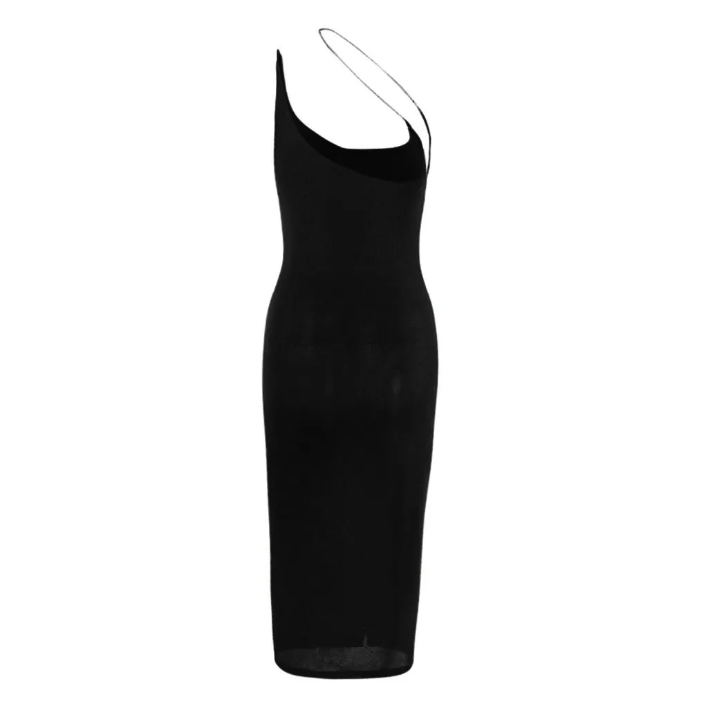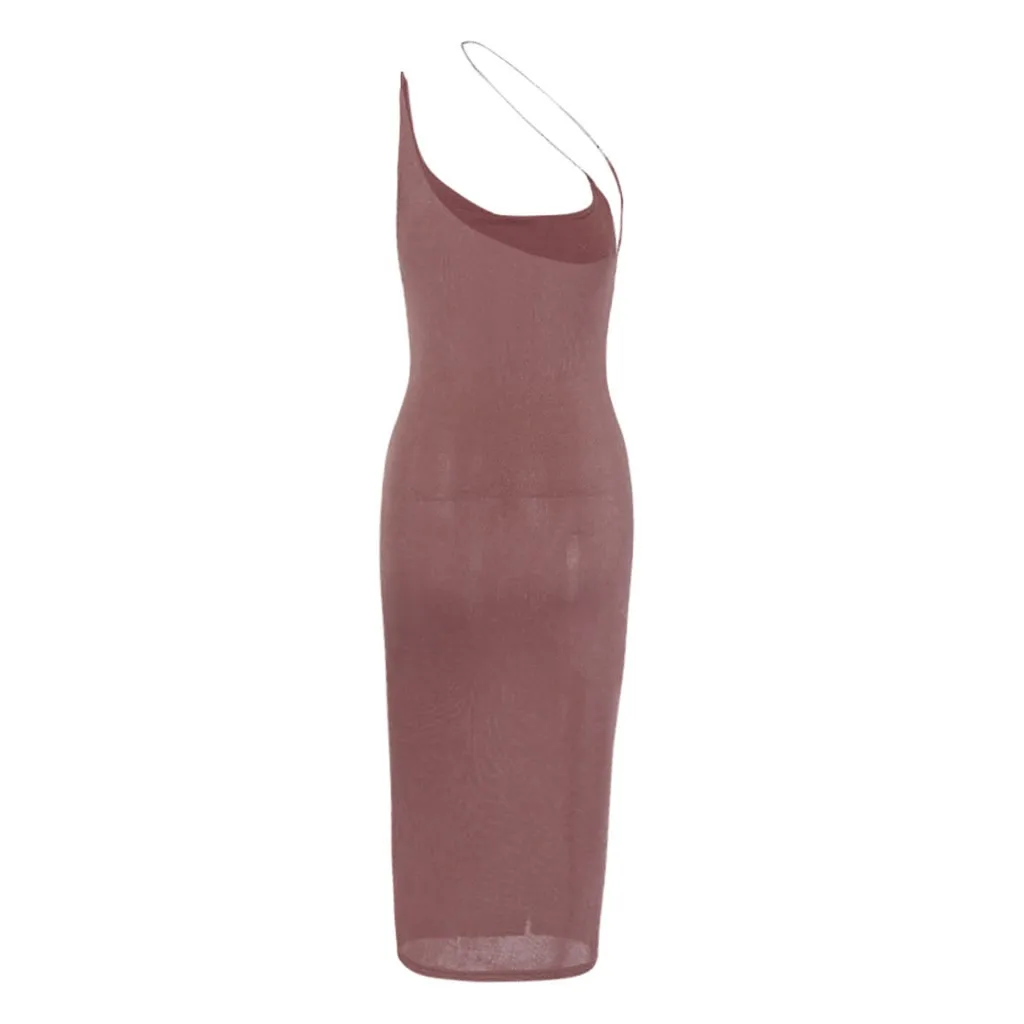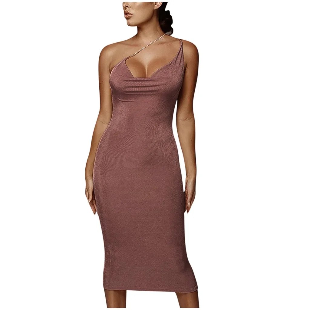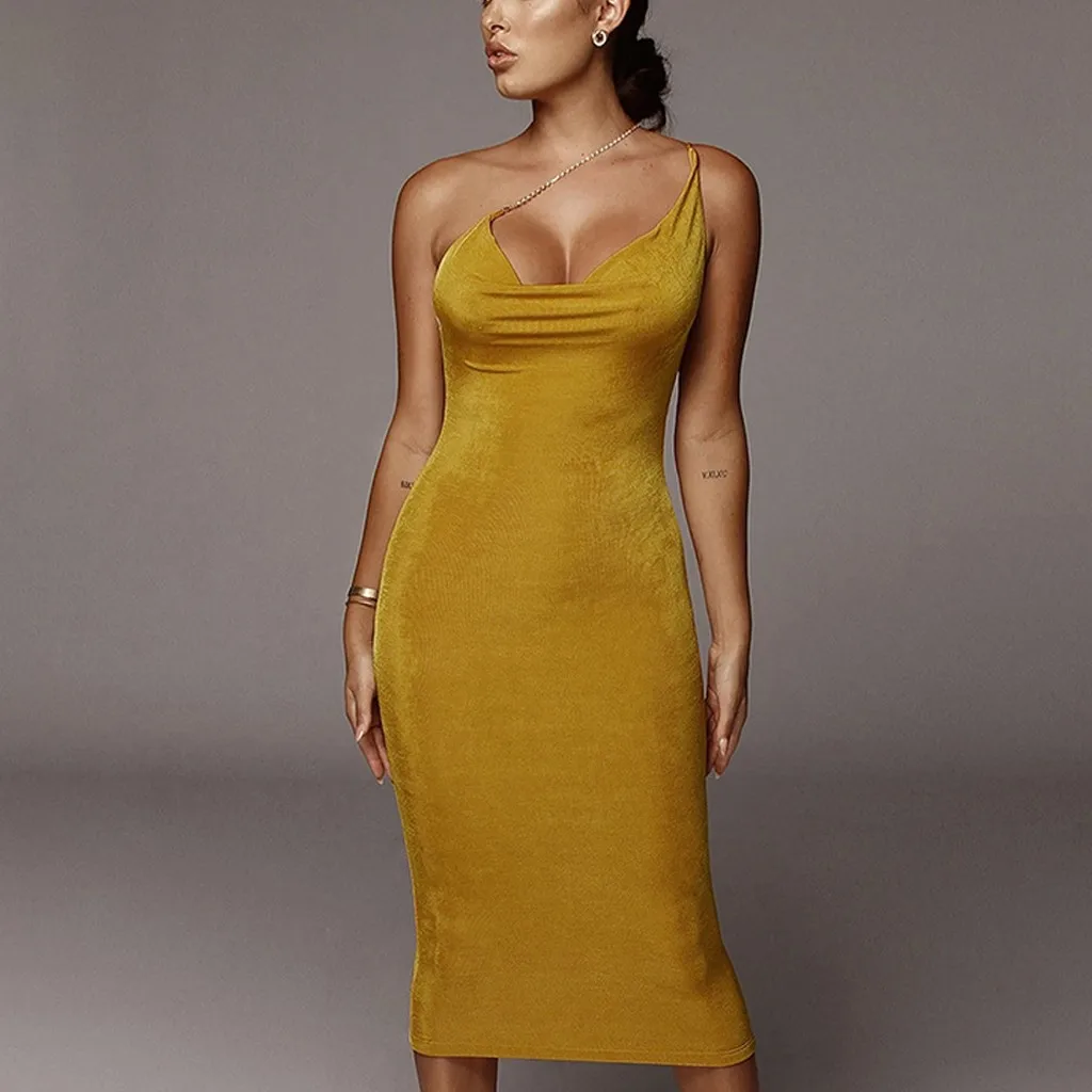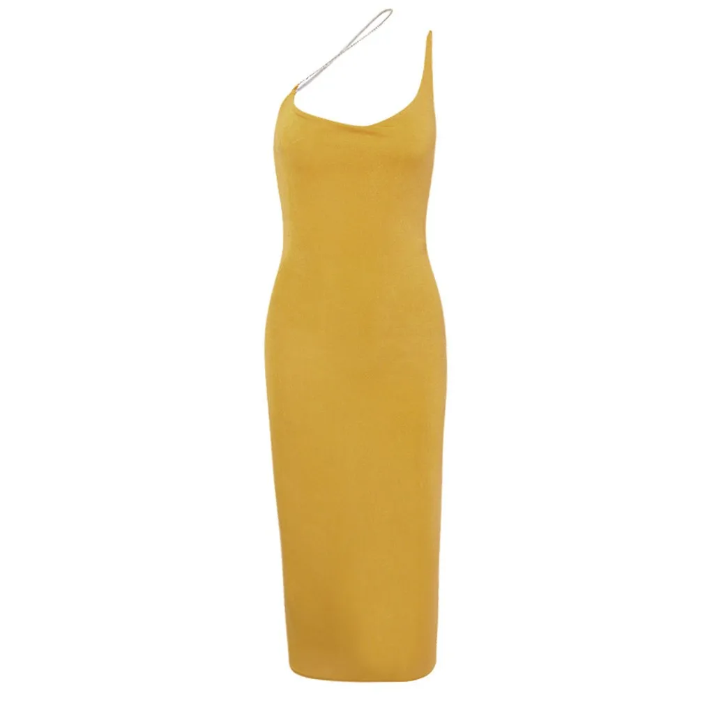 Женские платья до середины икры, сексуальные, одноцветные, на одно плечо, с цепочкой, с высокой талией, сумка на бедрах, вечерние платья, весна-лето 2020, бодикон, сексуальное платье