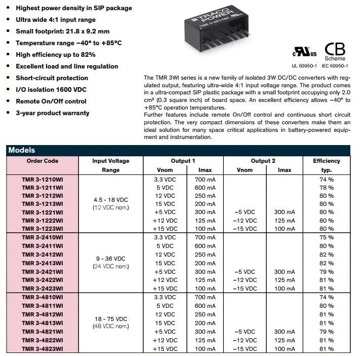 TRACO POWER TMR 3-2412WI TMR3-2412 TMR3-2412WI TMR3 DC преобразователь 2V 3W 1 выход-12V-250mA input-9V-36V
