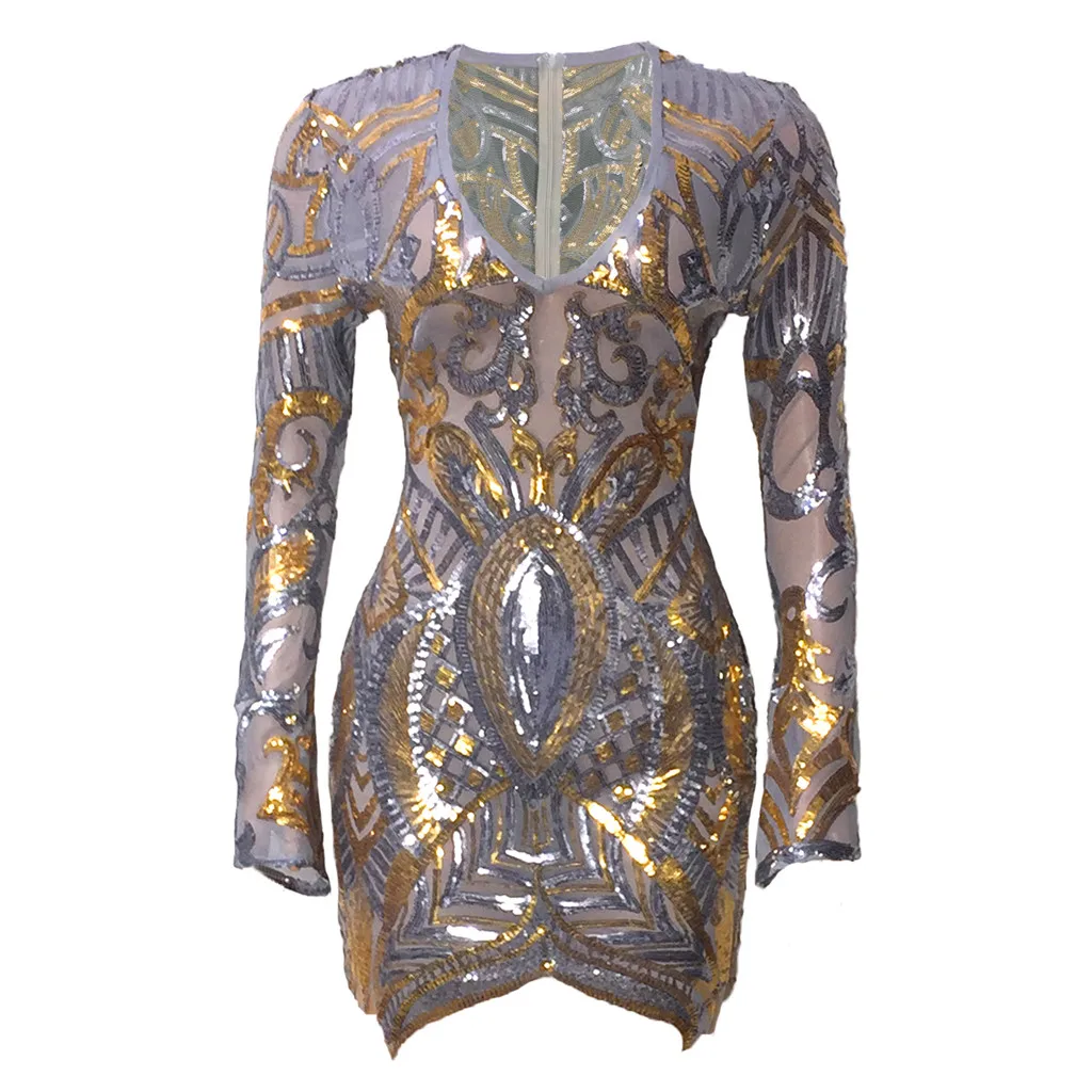 Модное женское сексуальное вечернее платье с блестками и глубоким v-образным вырезом и асимметричным подолом с длинным рукавом