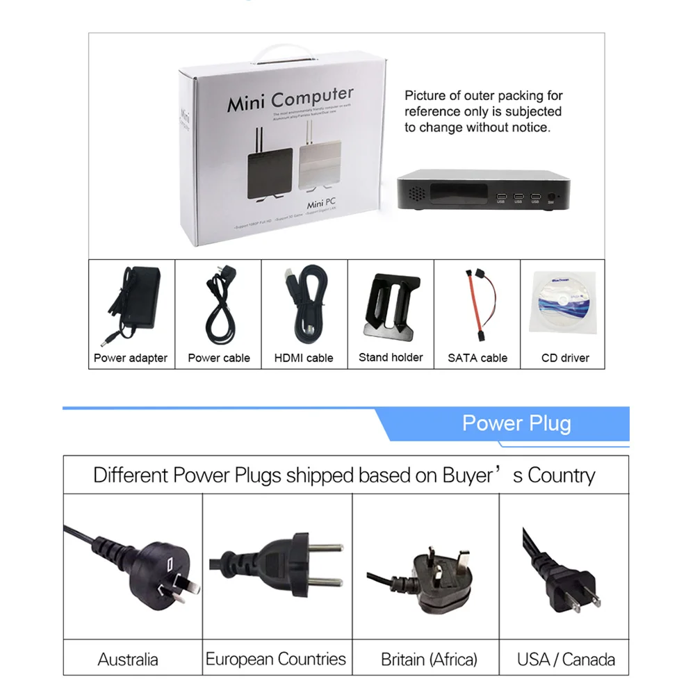 1 мини ПК (конфигурация в соответствии с заказом) 1x адаптер питания (мы отправляем правильный штекер питания в соответствии с адресом покупателя) 1xbracket 1x модуль Wi-Fi 1 * HDMI кабель 1x пользовательский manaul и гарантийный талон