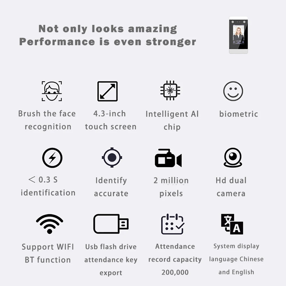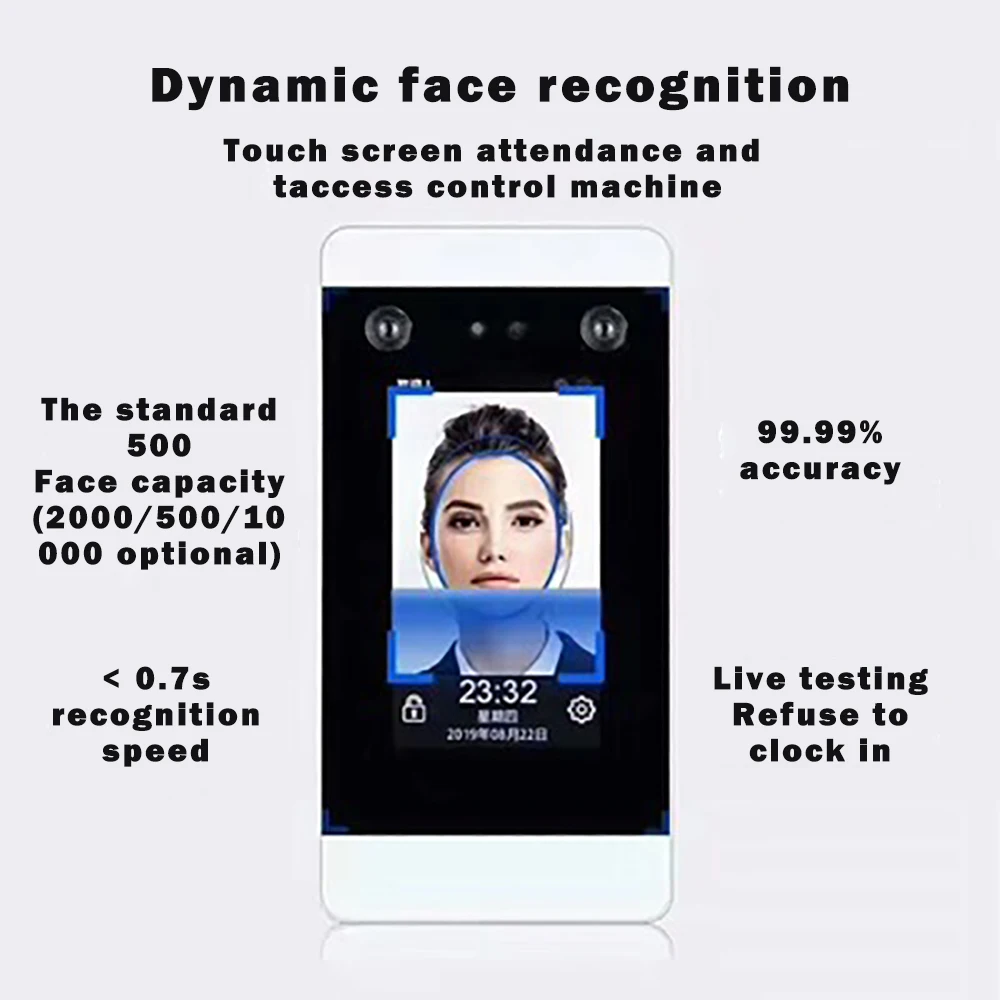 Особенности: 1. Международный Лидирующий ультра-быстрый алгоритм распознавания. 2. Инфракрасный светильник, яркий двойной объектив. Идеальное равновесие FAR & FRR. 3. Инновационная технология соответствия для обнаружения в реальном времени, устранения фото и модельных атак. 4. Три способа идентификации: Распознавание лиц. 5. 4,3-дюймовый сенсорный экран по отпечаткам пальцев 6. Процесс травления и зеркальная технология соответствуют эргономике. Параметры: Состояние на 100% абсолютно новый Тип товара: динамический контроль доступа лица посещаемость машины Цвет: как на картинке Материал: ПК Процессор: ARM Cortex-A7 четырехъядерный, 1,2G Камера: Двойная камера (инфракрасное излучение с высоким разрешением и красочная двойная камера) Инфракрасный светодиодный: Поддержка ЖК-дисплей: 4,3-дюймовый высокой четкости сенсорный Экран Инфракрасный приёмник: Поддержка Тип экрана: сенсорный экран Коммуникация: TCP / IP, U диск Звук: Поддержка Рабочее напряжение: DC12V 2A Окружающий светильник Flux: 0-50000lux Рабочая температура: 0 °C-40 °C Рабочая влажность (RH): 20%-80% Уход за кожей лица Ёмкость: 2000 Для хранения Ёмкость: 2000000 Метод распознавания: лицо, Язык: китайский/английский Функция самостоятельного тестирования: Поддержка Распознавание: 0,3 S Интеллектуальное обновление лица: Поддержка Метод идентификации: 1:1, 1:n Датчик двери (EN-MG): вход магнитного сигнала двери Сигнал тревоги: сигнал тревоги Выход Дверной звонок: дверной звонок Выход Выход: входной сигнал дверного выключателя Сигнал тревоги: Поддержка Цепь: Перенапряжение материнской платы, анти-реверс, анти-гром, анти-всплеск и т. Д.