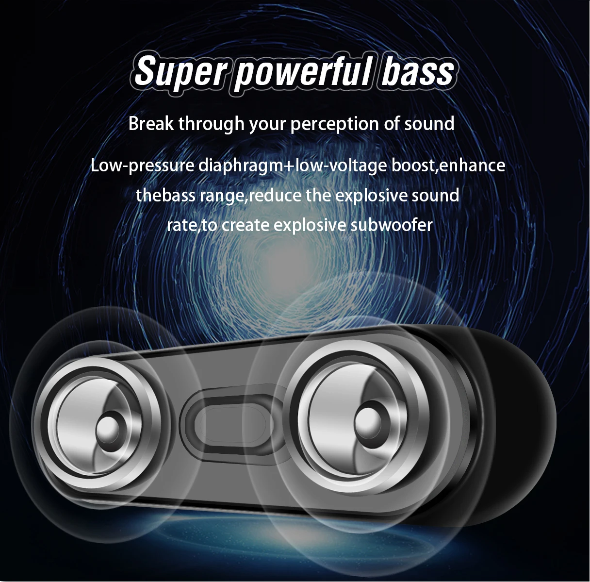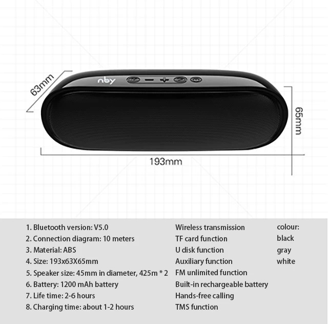 Версия Bluetooth: 5,0 Диапазон Bluetooth: 10 м Выходная мощность: 5 Вт * 2 Время работы: 3-4hours Рабочее напряжение: 5 В постоянного тока Уровень шума сигнала: ≥ 80 Емкость аккумулятора: 1200 мАч Цвет: черный, серый, белый Размер продукта: 193*65*63 мм