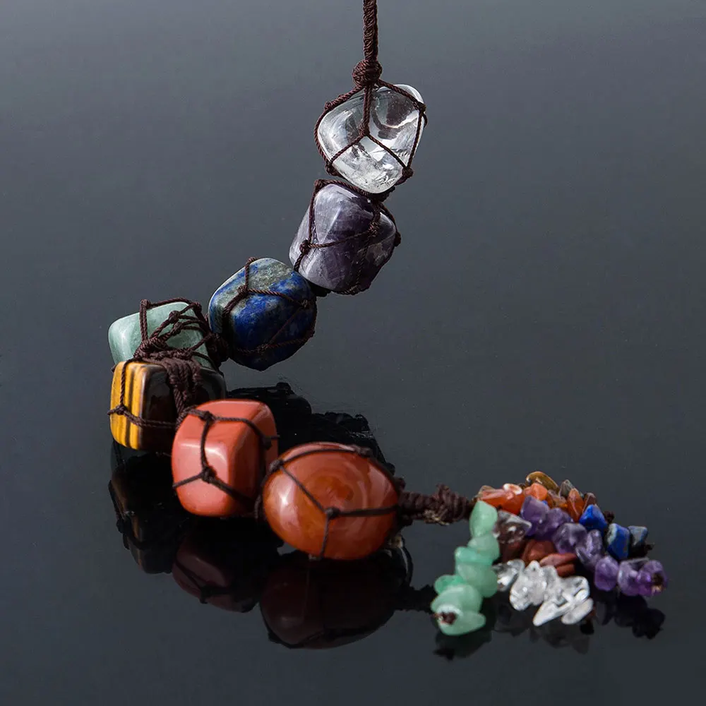 7 капель чакры и кристаллические драгоценные камни от t-op до дна соответственно: Прозрачный кристаллический кварц, аметист, содалит, зеленая авантюрин, тигровый глаз, красный агат, красная яшма.