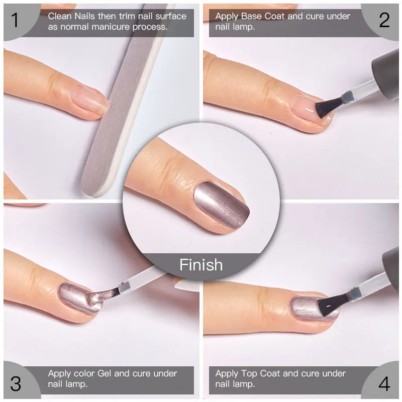 Шаг 6: не протирайте верхнее покрытие и снова вылечивайте под лампой для ногтей. Или обычное верхнее покрытие, но удалите липкую поверхность хлопком, смоченным моющим средством или спиртом 95 ° после отверждения.