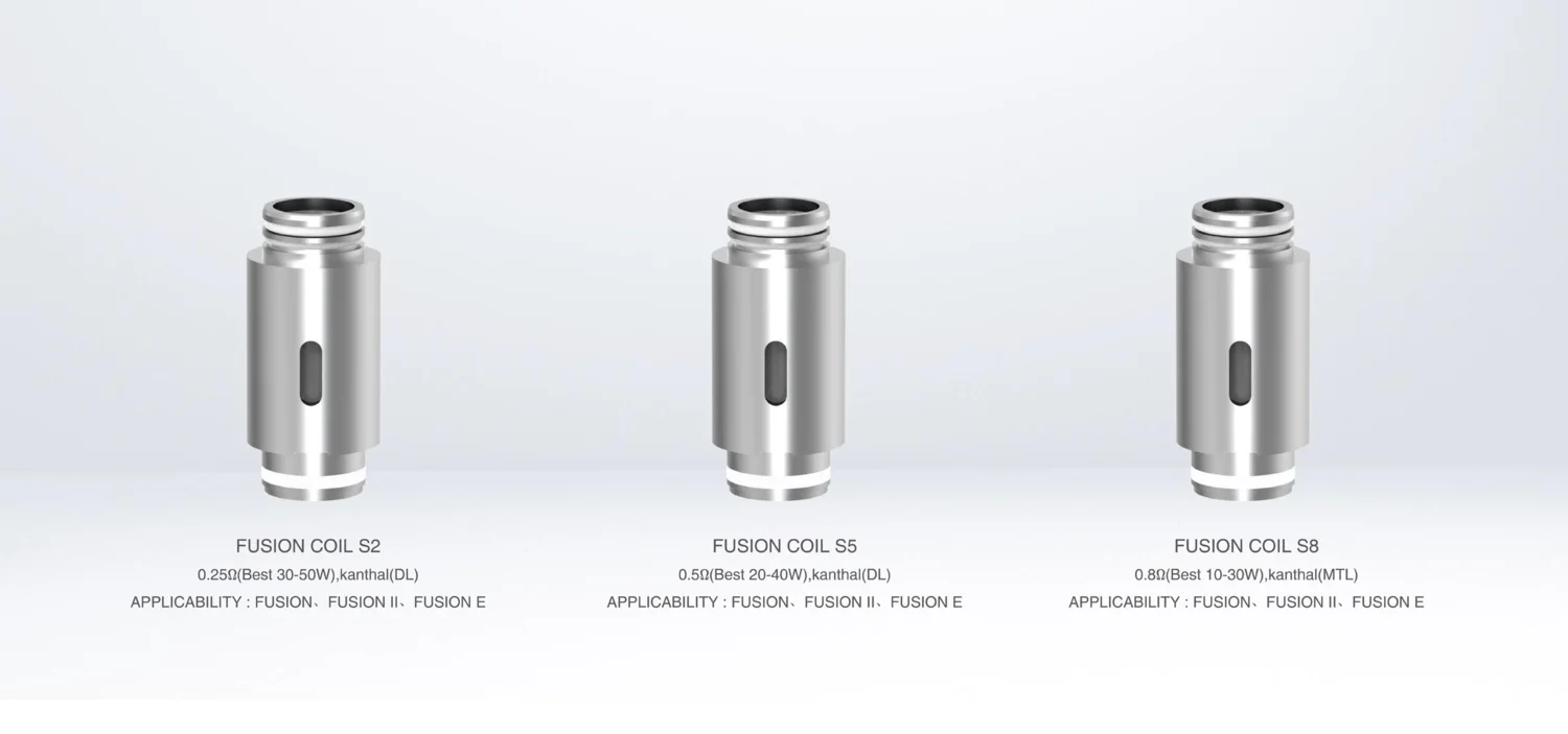 Vaptio Fusion S2 катушки: Сопротивление 0,25 Ом, Катушка * 5 шт./упак., Идеально подходит для: Fusion,Fusion 3,8 мл, Fusion II. Vaptio Fusion S5 катушка: 0,5 ohm Сопротивление Катушка * 5 шт./упак., Идеально подходит для: Fusion,Fusion 3,8 мл, Fusion II, Fusion E kit. Vaptio Fusion S8 катушка: 0,8 ohm Сопротивление Катушка * 5 шт./упак., Идеально подходит для: Fusion,Fusion 3,8 мл, Fusion II, Fusion E kit.