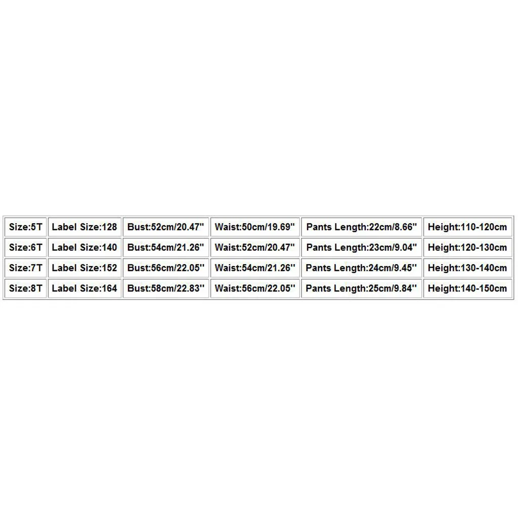 Размер Этикетка Размеры Обхват груди Обхват талии Брюки Длина Высота 5 T 128 52 см/20,47" 50 см/19,69" 22 см/8,66" 110-120 см До 6 ти лет 140 54 см/21,26" 52 см/20,47" 23 см/9,04" 120-130 см 7 T 152 56 см/22,05'' 54 см/21,26'' 24 см/9,45'' 130-140 см 8 лет 164 58 см/22,83'' 56 см/22,05'' 25 см/9,84'' 140-150 см