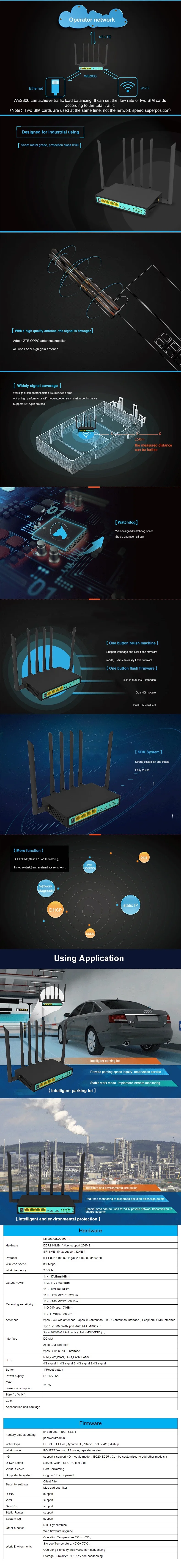 Набор микросхем MT7628AN, частота до 580 МГц, высокая производительность и стабильность Поддержка IEEE 802.11b, IEEE 802,11g, IEEE 802.11n Беспроводной стандарт, скорость беспроводной передачи до 300 Мбит/с Поддержка IEEE 802,3/3u стандарт, 1WAN + 4LAN 10/100 м адаптивный сетевой порт, Поддержка автоматический флип (Auto MDI/MDIX Bulit-in двойной интерфейс PCIE, поддержка двойного модуля 4G, две sim-карты, а также поддержка одного модуля 4G, две sim-карты (автоматическое переключение) Встроенный часовой механизм для обеспечения стабильной работы системы Поддержка 12V или 32V DC источника питания, могут быть выполнены по индивидуальному заказу в соответствии с пожеланиями заказчика Новая операционная система, дистанционное управление