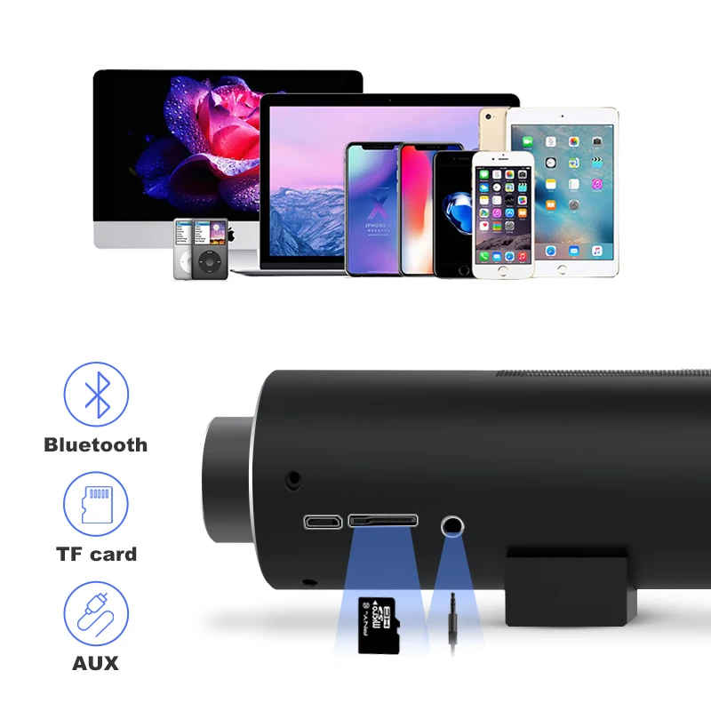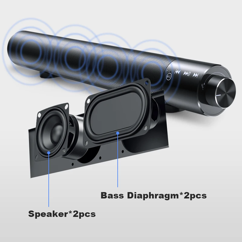 Всего 4 драйвера, мощный 10 Вт, выход до 105 дБ громкий звук, отлично подходит для большой гостиной Мощность Источник: DC 3,7 V Размер: 407 мм * 52 мм * 63 мм Сопротивление: 4Ω Основная плата: jianron Входная мощность: 3,5 мм AUX Рог: два динамика, два громкоговорителя диафрагмы Выход Мощность: 5Wx2 Емкость аккумулятора: 5200 мАч Частотная характеристика: 100 Гц-18 кГц Версия Bluetooth:Bluetooth 5,0