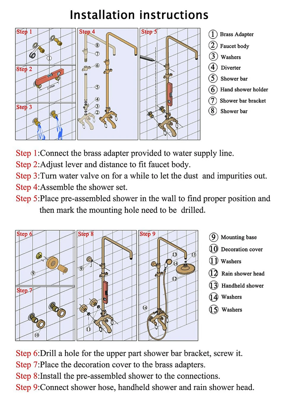 Style: Contemporary Finish: Chrome Shower Head: Rainfall shower faucet Showerhead Material: BRASS Handshower material : BRASS Showerhead Dimension: 8 inch(20CM) Faucet Total Height (cm): 80-120cm(31.5inch-47inch)Please contact us if you need a higher style. Distance of center to center 13.5-17cm(5.3"-6.6") can be adjustable Installation Holes: Three Holes Number of Handles: Single handle Valve Type: Ceramic Valve Faucet Body Material: Brass Faucet Spout Material: Brass