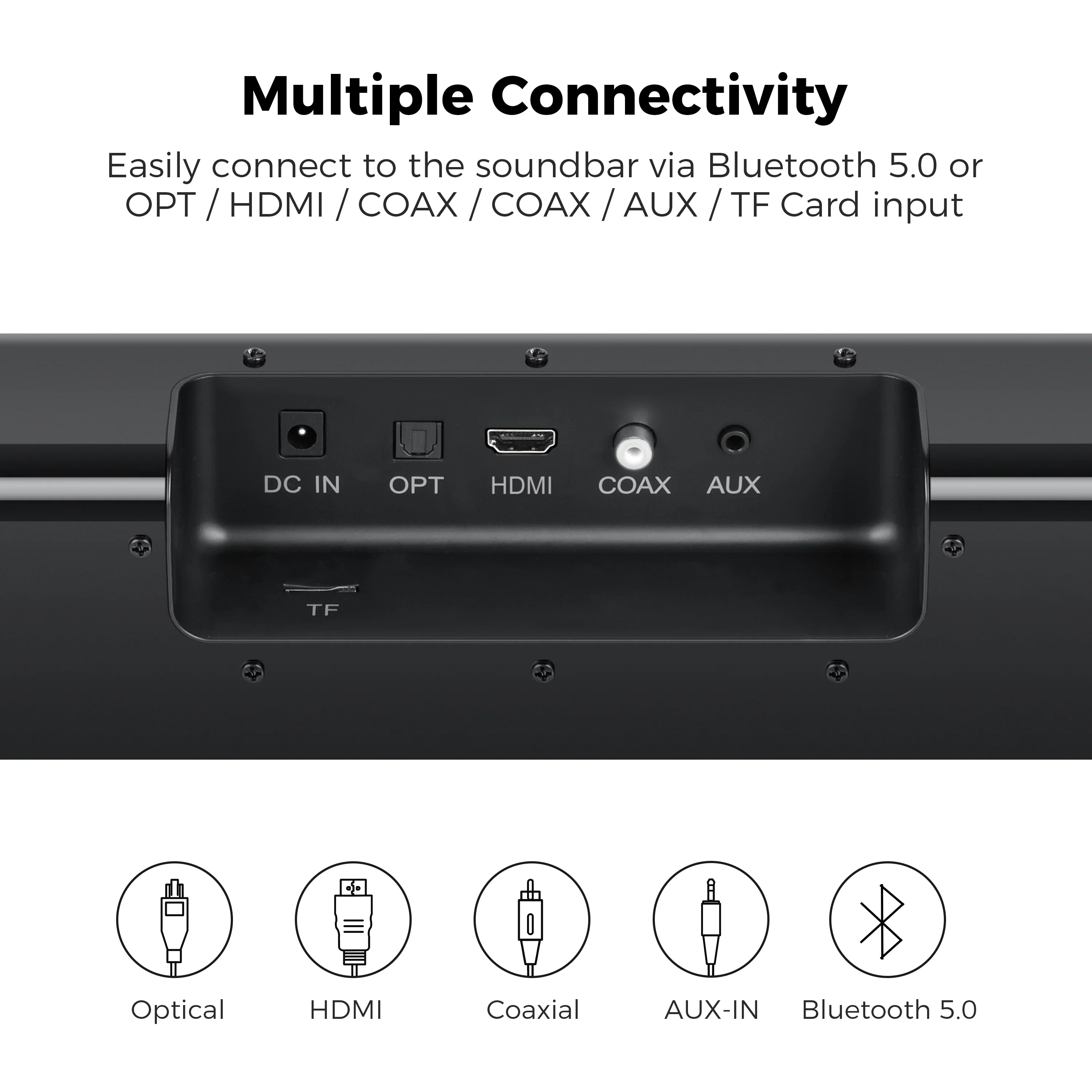Легко подключайте большинство ваших устройств, звуковая панель поддерживает оптические/RCA/AUX/Bluetooth соединения, наслаждайтесь непревзойденным доступом с помощью нескольких доступных методов сопряжения.