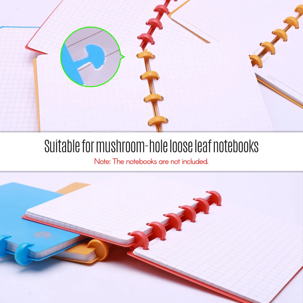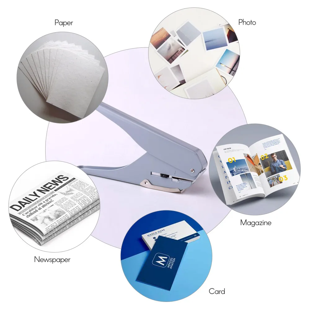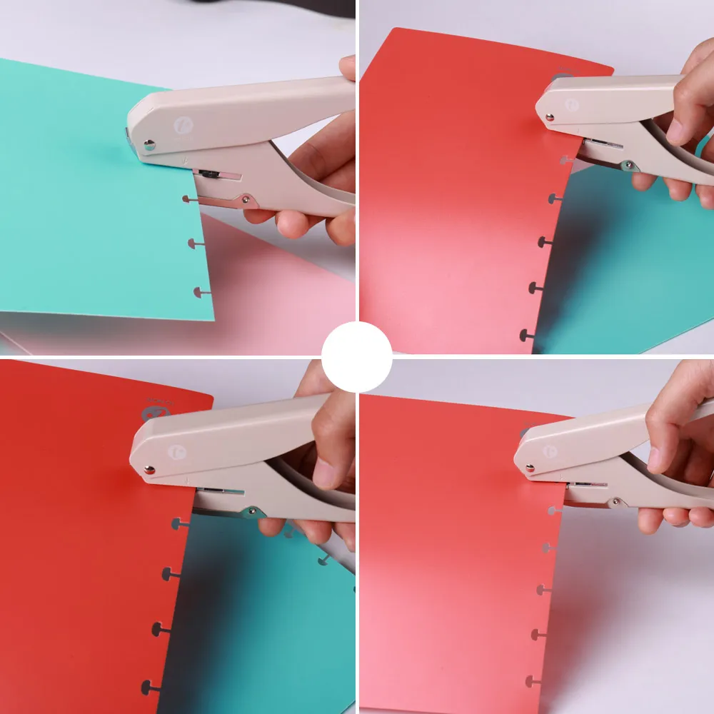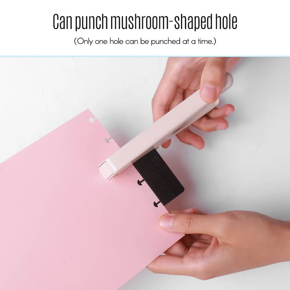 Можно пробить отверстие в форме гриба, только одно отверстие можно пробить за раз, подходит для блокнотов свободного листа.