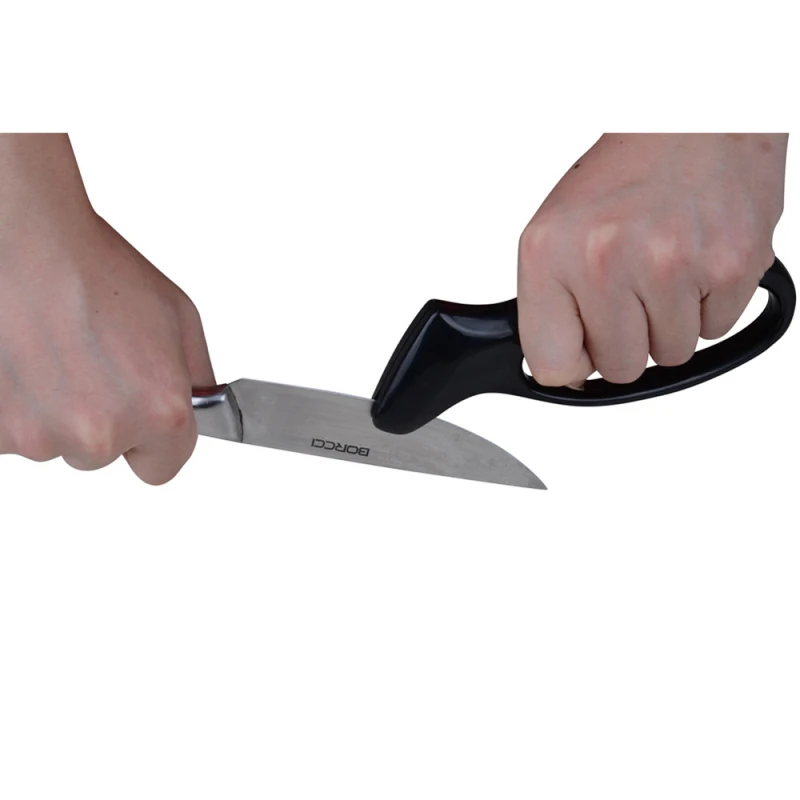 Особенности продукта:Долговечный карбиDe SteelТочит любые не зубчатые ножи за 10 секунд3 или 4 быстрых штрихов-это все, что нужноНе разрушительный, как типичная точилка для ножейИспользование инструкции:1. Поместите нож на твердую плоскую поверхность с режущей кромкой лицом вверх, одна рука держит точилку, другая вмещает нож, убедитесь, что остальные четыре пальца поместили в защиту пальца.2. Нажмите Вниз и поместите нож в слот “V”-вольфрамовый этап, потяните назад несколько раз для грубой заточки.Примечание: Не тяните вперед и назад, только тяните назад. Эта точилка не подходит для керамического ножа, пожалуйста, используйте с осторожностью! Внимание:Не используйте точилку для ножа, чтобы заточить зубчатые лезвия или ножницы.Чтобы не повредить нож, слегка заточите нож и не затачивайте его назад и вперед.Не помещайте точилку в посудомоечную машину или Не погружайте в воду.Пожалуйста, поместите точилку ножа и нож в недоступном для детей месте, чтобы избежать каких-либо несчастных случаевУпаковка включает: