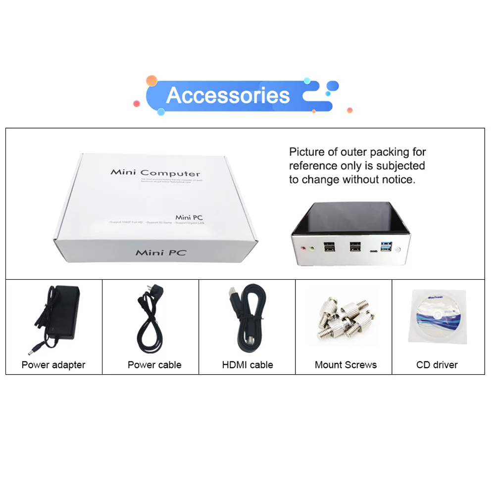 1 мини ПК (конфигурация в соответствии с заказом) 1x адаптер питания (мы отправляем правильный штекер питания в соответствии с адресом покупателя) 1xMount винты 1x модуль Wi-Fi 1 * HDMI кабель 1x пользовательский manaul и гарантийный талон