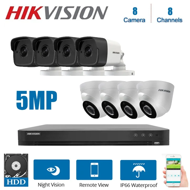 1 * DS-7208HUHI-K1/E 8 каналов DVR (Который может поддерживать макс. 8 камер 5 Мп) 4*5 Мп Hikvision DS-2CE56H0T-IT3F камера с возможностью съемки видео 4*5 Мп Hikvision DS-2CE16H0T-ITF камера 8*12 В адаптер питания 1 * HDD опционально